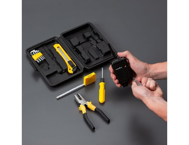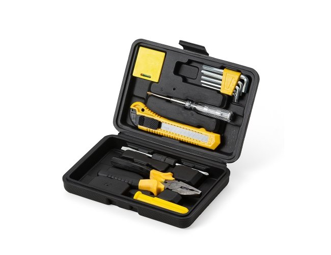 Kit ferramenta 11 peças em estojo plástico. Maleta plástica com detalhe retangular no centro frontal e verso com o detalhe na lateral inferior, possui texturização no estojo e uma trava superior. Acompanha: conjunto de 5 chaves Allen, trena de 1 metro, chave teste, estilete, chave dupla(Phillips e Fenda), alicate e cabo plástico para encaixe da chave dupla.