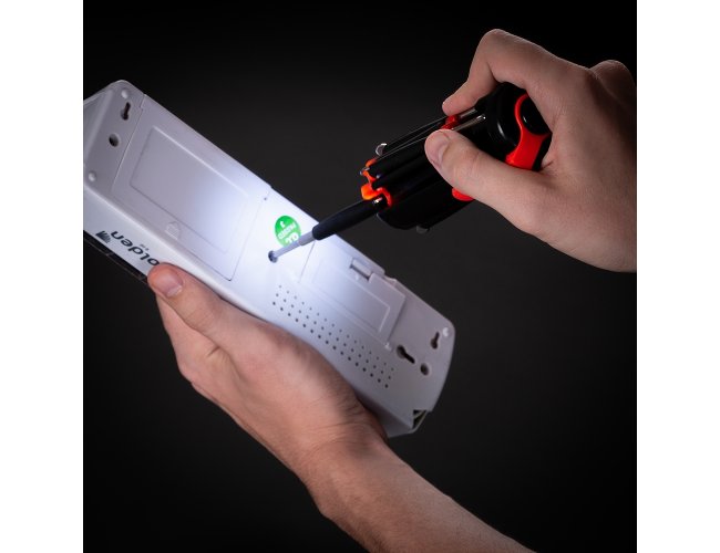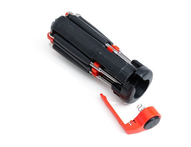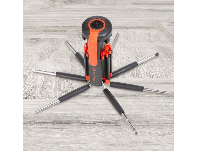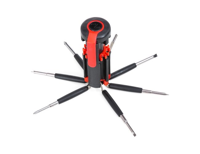 Kit ferramenta retrátil com 7 chaves e lanterna de 6 Leds. Material plástico, possui 3 chaves Philips; 3 chaves de fenda; chave de ponta dupla sendo um mini Philips e uma mini Fenda em cada extremidade, basta desrosquear as tampas para visualizá-las. Clip vermelho com setas explicativas para abertura do compartimento de pilhas, pressione a localização da seta superior e empurre ao mesmo tempo a parte inferior para remoção, necessita de 3 pilhas AAA(não acompanha).
