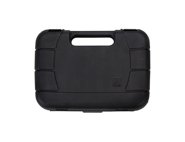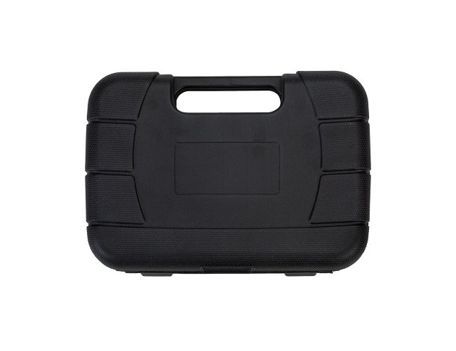Kit ferramenta 8 peças em estojo plástico. Maleta plástica com detalhe retangular no centro frontal e verso liso, possui texturização no estojo e duas travas superiores. Acompanha: fita isolante, martelo, alicate, chave Philips, chave teste, chave de fenda, trena 2 metros e estilete.