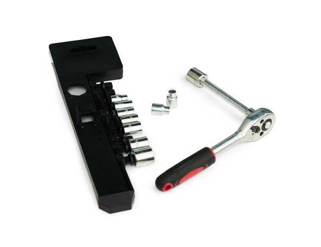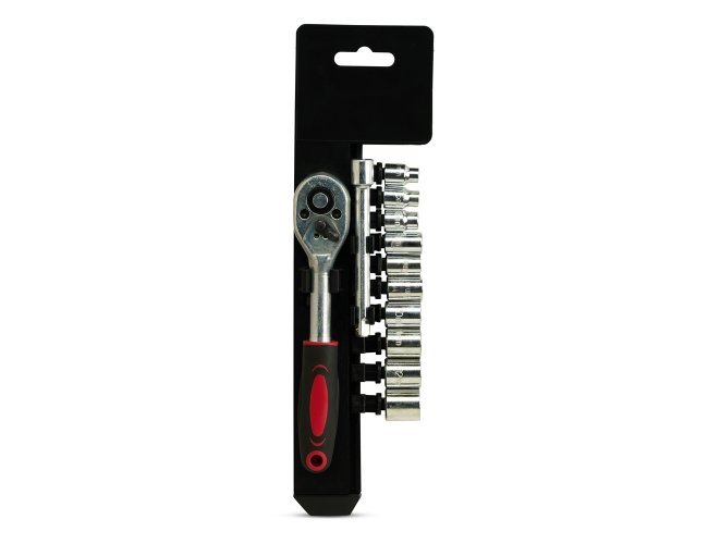 Kit ferramenta com 12 peças em estojo plástico. Contém: 1 chave catraca, 1 chave extensora e 10 soquetes.
