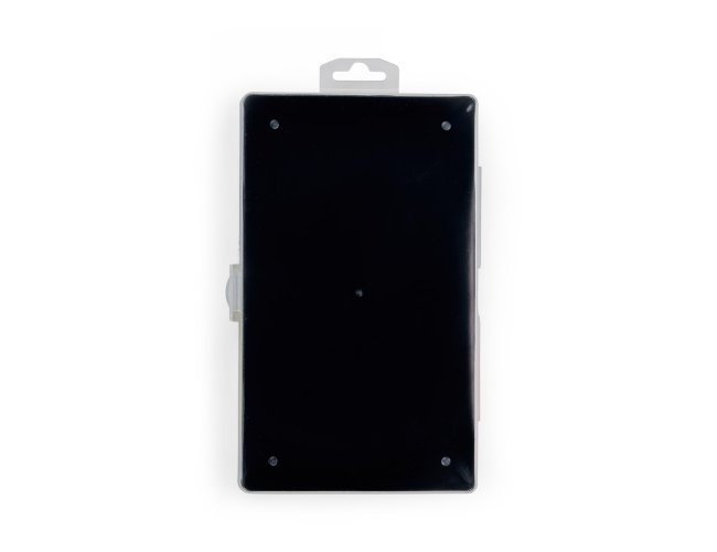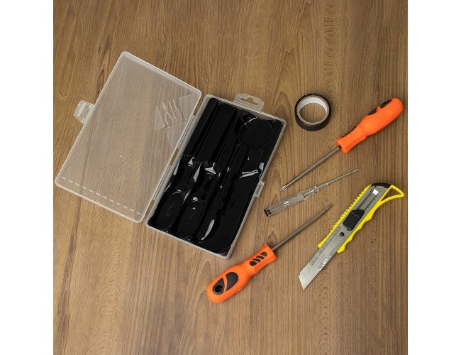 Kit ferramentas 5 peças em estojo plástico com trava de segurança. Contém Uma chave phillips, uma chave de fenda, uma chave teste, um estilete e uma fita isolante.
