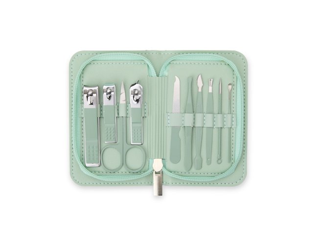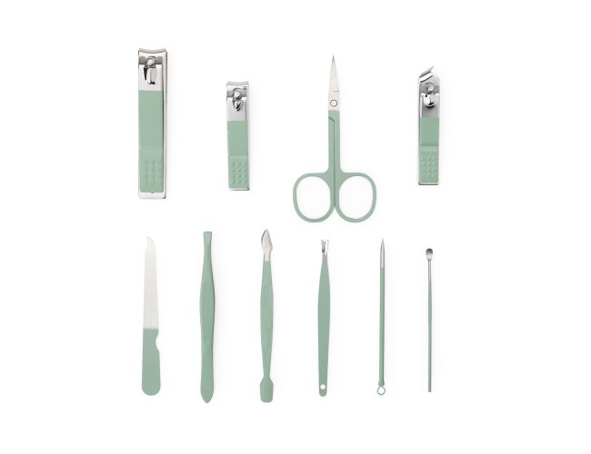 Kit Manicure 10 peças em estojo de couro sintético, perfeito para embelezar e cuidar das unhas, podendo ser usado em casa ou em salões de beleza. Com três cortadores de unha, tesoura, lixa, pinça, empurrador de cutícula, removedor de cutícula, palito de unha e espátula para ouvido, este kit oferece tudo o que precisa para manter as unhas e cuidados sempre em dia.