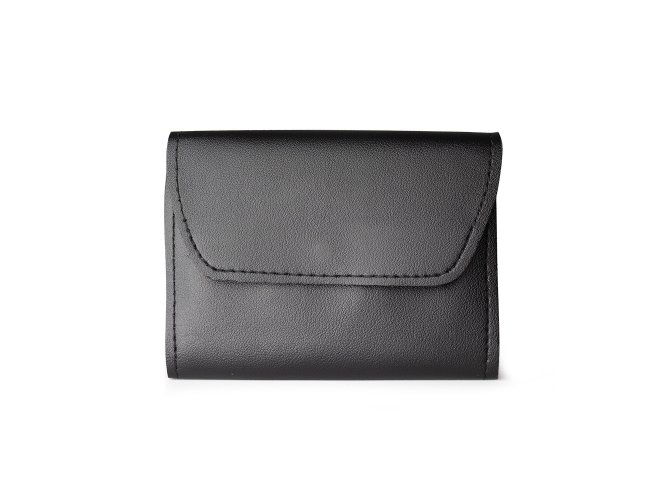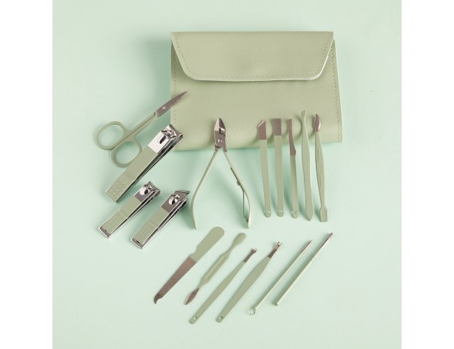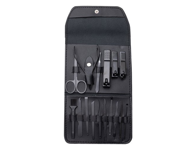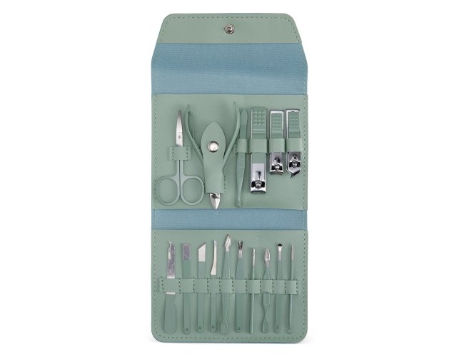 Kit manicure 16 peças em estojo de couro sintético estilo envelope, contém: tesoura, alicate de cutícula, pinça, 3 cortadores de unha, lixa, 2 bisturis, raspador, empurrador de cutícula, removedor de cutícula, espátula dupla para limpeza das unhas, limpador de ouvido, palito de unha e espátula para ouvido.