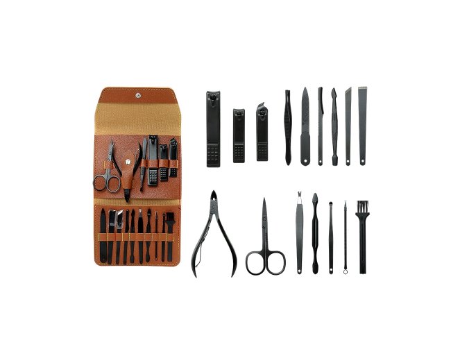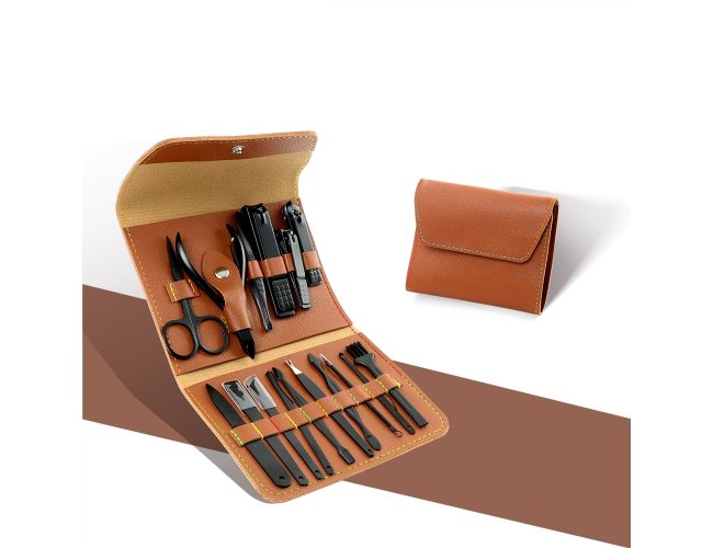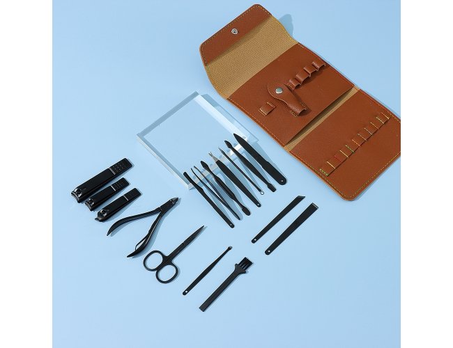 Kit manicure 16 peças em estojo de couro sintético estilo envelope, contém: tesoura, alicate de cutícula, pinça, 3 cortadores de unha, lixa, espátula dupla para limpeza das unhas, empurrador de cutícula, 2 bisturis, raspador, removedor de cutícula, palito de unha, espátula para ouvido e pincel.