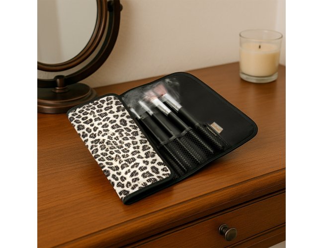 Kit de pincéis de maquiagem com cabos em MDF e cerdas sintéticas macias. Com 12 pincéis para diversas funções, o kit inclui: um pente-escova para cílios e sobrancelhas, além de pincel para a aplicação de base, corretivo, delineador, sombra e batom líquido. Acompanha nécessaire dobrável com bolso interno em tela de nylon e fechamento por botões magnéticos.