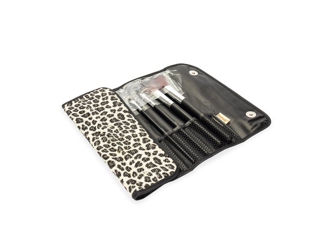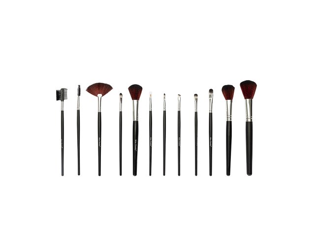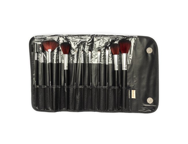 Kit com 12 pincéis de maquiagem com cabos em MDF e cerdas sintéticas macias. O conjunto inclui: um pente-escova para cílios e sobrancelhas, além de pincel para a aplicação de base, corretivo, delineador, sombra e batom líquido. Acompanha nécessaire dobrável com bolso interno em tela de nylon e fechamento por botões magnéticos.
