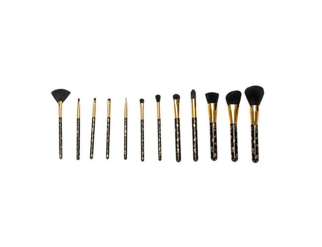 Kit de 12 pincéis para maquiagem com cerdas macias. O conjunto traz pincéis para diversas funções, incluindo: pincel para pó, blush/iluminador, base, esfumar, largo para sobrancelhas, pequeno para esfumar, grande para sombreamento, angular para sobrancelhas, lábios, delineador e pincel em formato de leque.