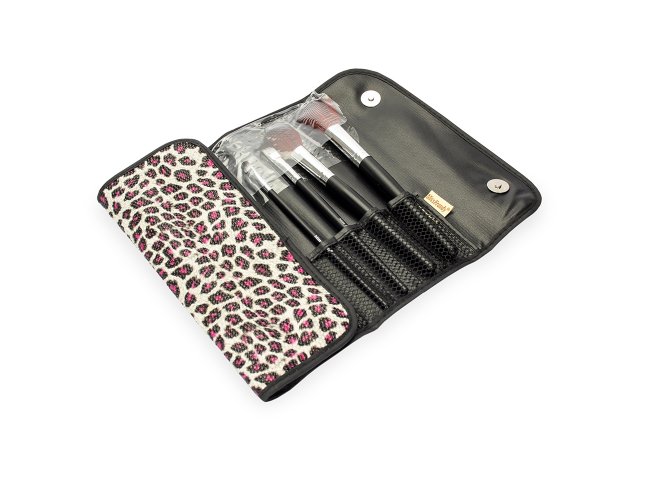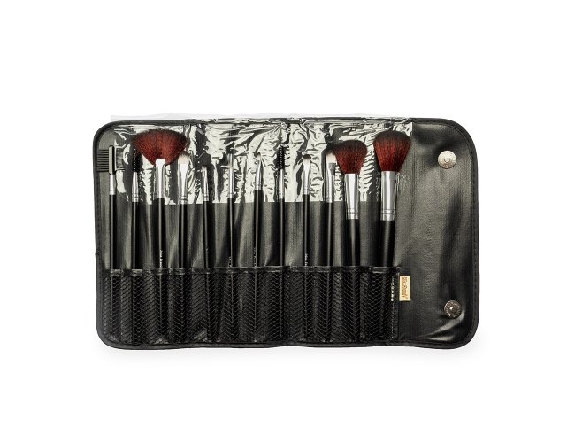 Kit com 12 pincéis de maquiagem com cabos em MDF e cerdas sintéticas macias. O conjunto inclui: pente-escova para cílios e sobrancelhas, duas escovas para cílios, dois pincéis língua de gato para produtos líquidos, além de pincéis para aplicação de base, corretivo, delineador, sombra e batom líquido. Acompanha nécessaire dobrável com bolso interno em tela de nylon e fechamento por botões magnéticos.