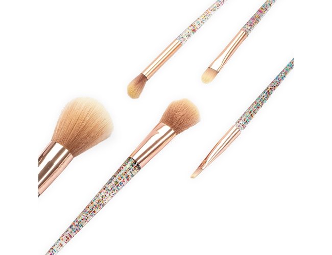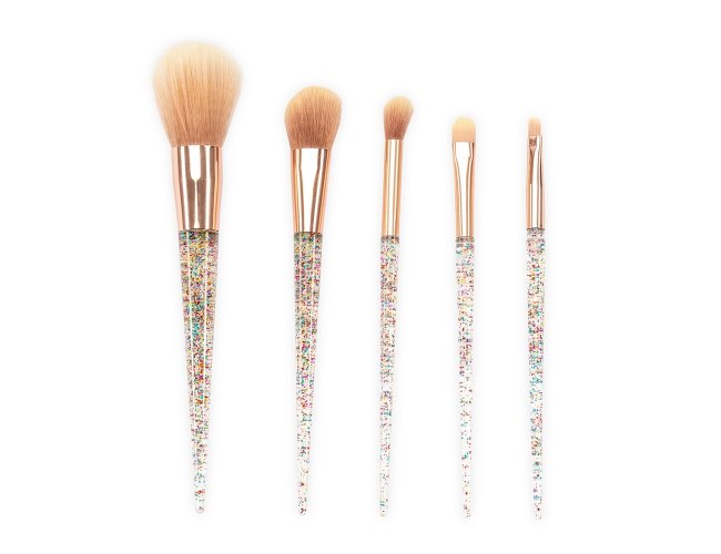 Kit composto por cinco pincéis de maquiagem com cabo plástico e cerdas sintéticas macias. O conjunto inclui: pincel para pó, pincel para blush, pincel para esfumar, pincel língua de gato para corretivo e pincel chanfrado para delinear.