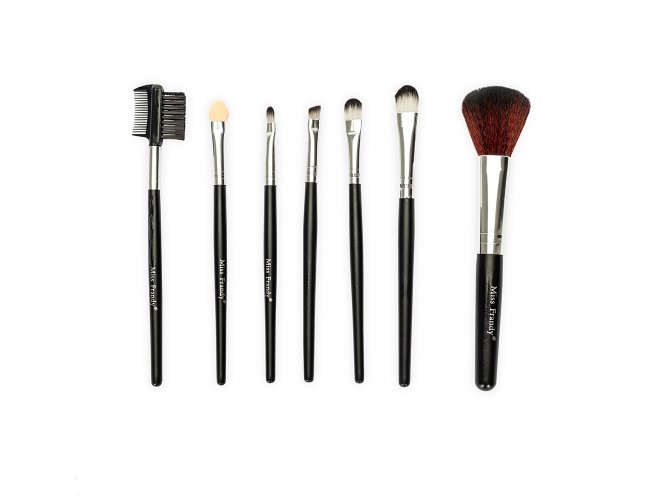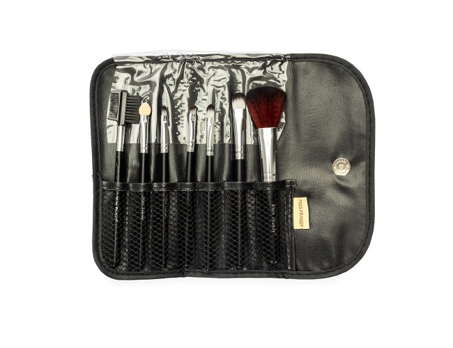 Kit com sete pincéis de tamanho compacto e cerdas sintéticas macias. O conjunto inclui, além de um pente-escova, pincéis dedicados para a aplicação de sombra, delineador, corretivo e iluminador. Acompanha nécessaire dobrável com bolso interno em tela de nylon e fechamento por botão magnético.