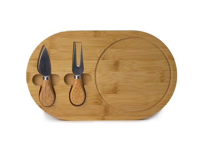 Kit queijo 3 peças, contém: tábua de bambu com canaleta, faca com ponta e garfo. Tábua com imã para encaixe e fixação dos utensílios.