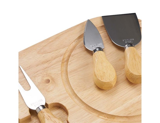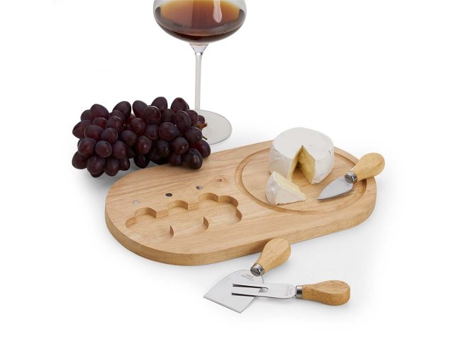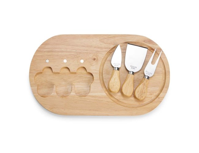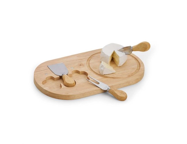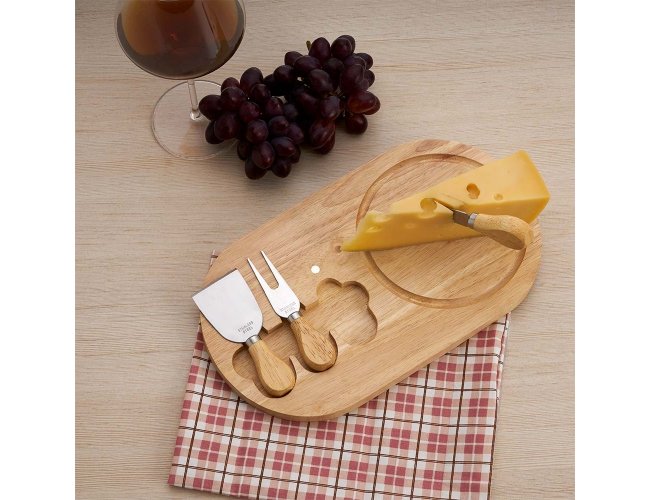 Kit queijo 4 peças, contém: tábua de madeira com canaleta, faca com ponta, garfo e espátula. Tábua com imã para encaixe e fixação dos utensílios.