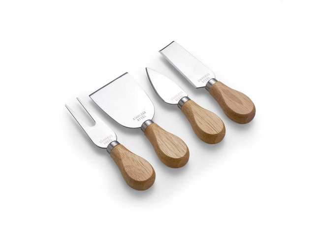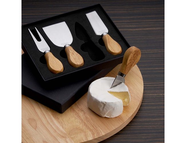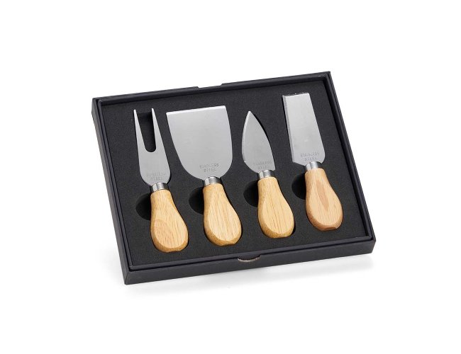 Kit queijo 4 peças em estojo de papelão com berço de espuma, contém: faca com ponta, faca reta, garfo e espátula