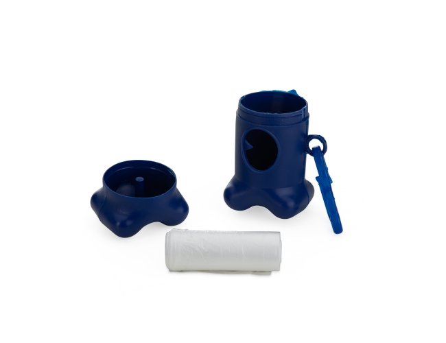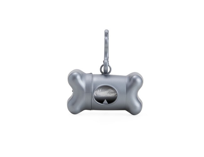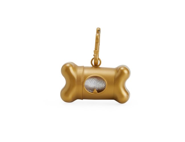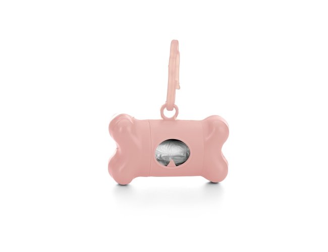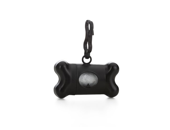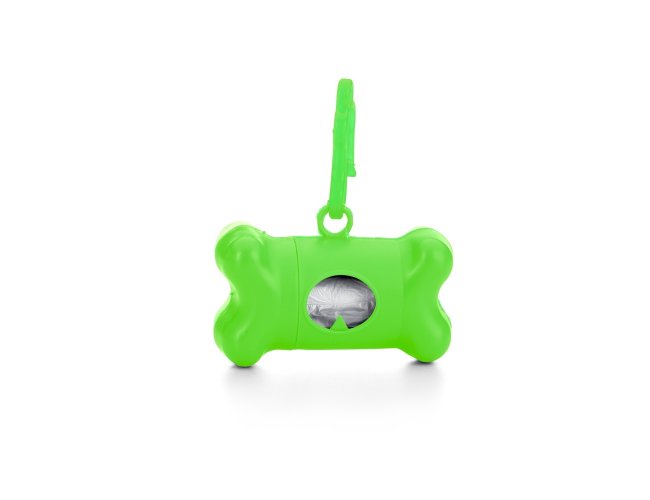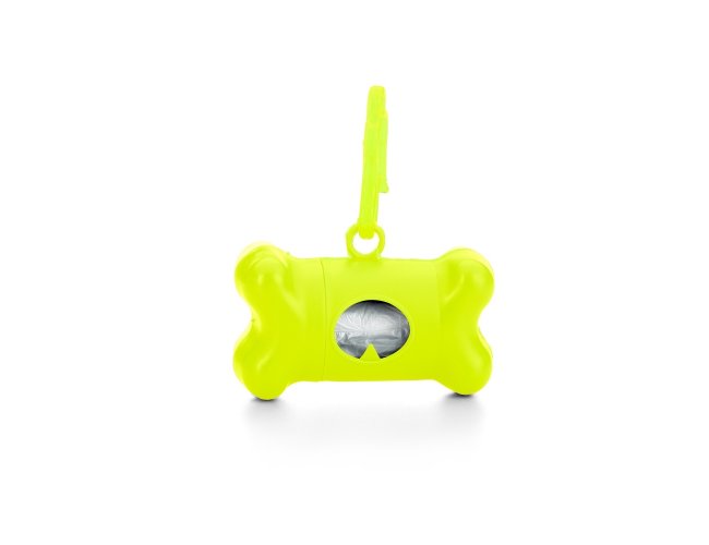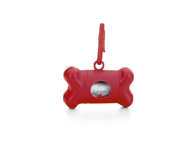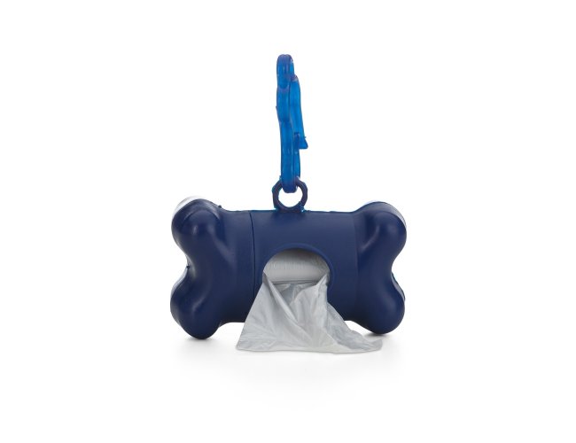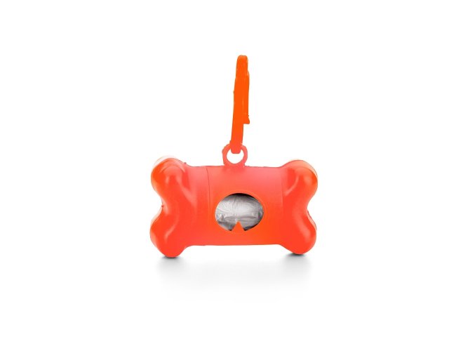 Kit saquinho coletor em formato de osso. Produzido em material plástico, o kit possui abertura lateral para encaixe do rolo e parte frontal vazada com dente plástico, permitindo puxar e destacar os saquinhos. Acompanha mosquetão e rolo de saquinhos.