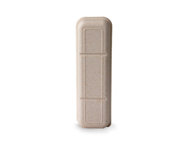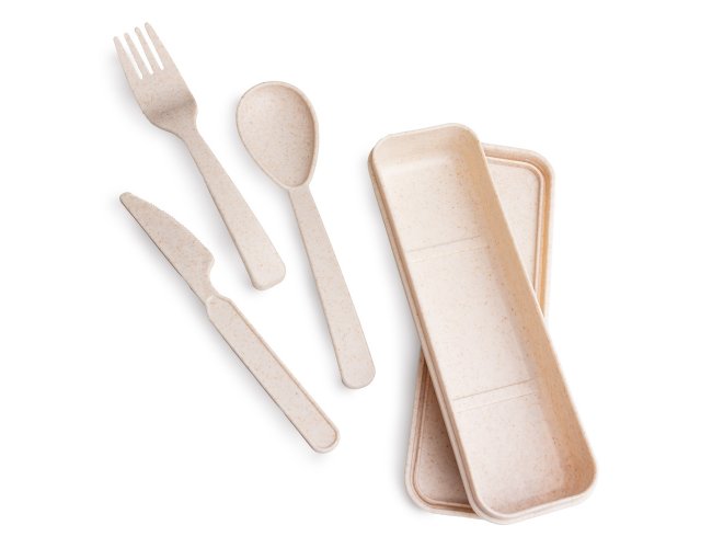Kit de talheres em fibra de trigo. Contém três peças: garfo, faca e colher, acompanhadas de estojo com tampa de encaixe.