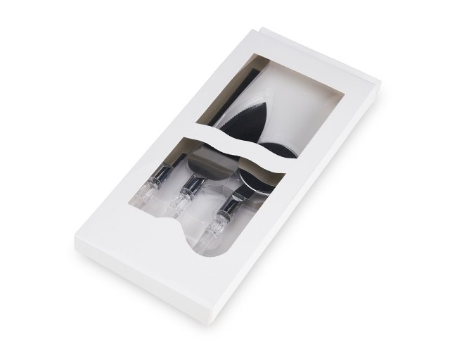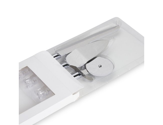 Kit utensílios de cozinha com 3 peças, composto por cortador de pizza, espátula e faca em inox com cabos plásticos. Acompanha estojo de papel.