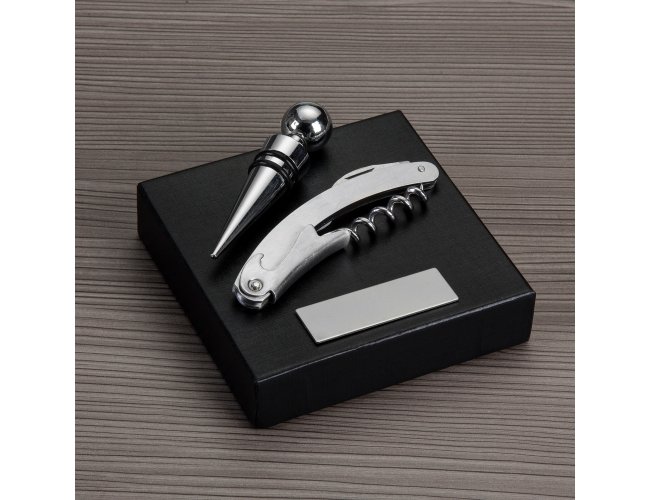 Kit vinho 2 peças em estojo com tampa, contém saca-rolhas metálico com lâmina de corte e abridor de garrafa e tampa de bico. Área interna do estojo com berço de espuma. Acompanha plaquinha metálica para personalização.