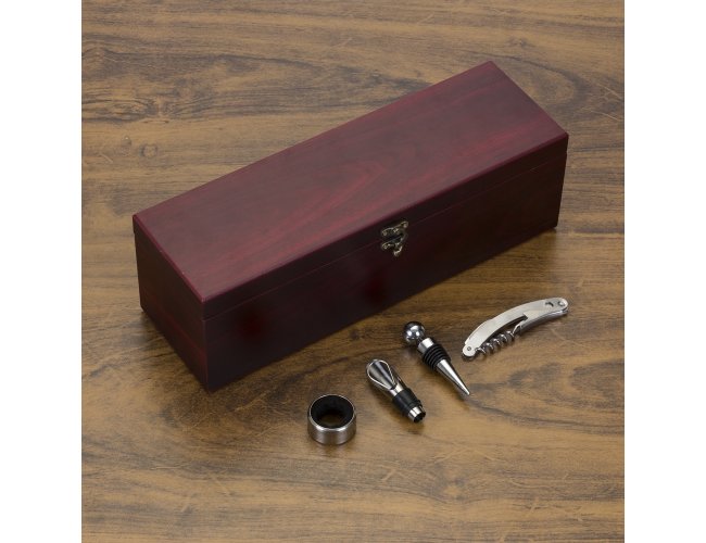 NÃO ACOMPANHA A GARRAFA DE VINHO Kit vinho 4 peças em maleta de madeira na cor vinho. Possui: wine collar, bico condutor com tampa, tampa de bico e saca rolha. Parte interna revestida com espuma e tecido vermelho, possui dobradiças douradas e trava metálica, parte inferior com borrachas anti-deslizantes.