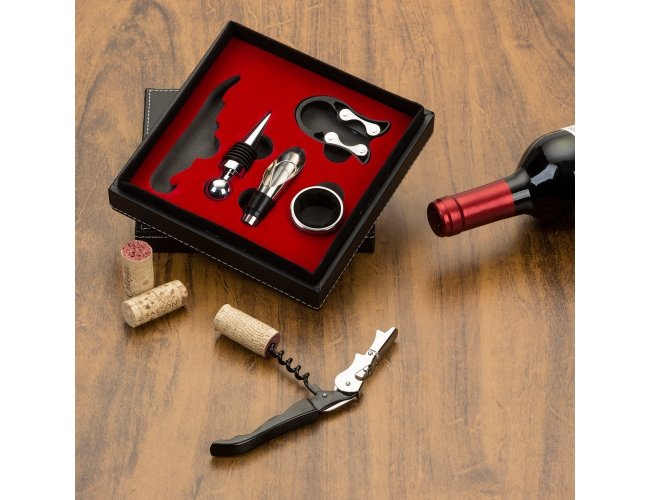 Kit vinho 5 peças em estojo de couro sintético com tampa, verso e parte interna revestida com veludo. Possui Wine collar, bico condutor com tampa, tampa de bico, saca rolhas e cortador de lacre.