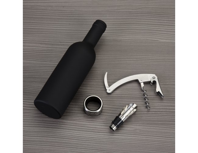 Kit vinho formato garrafa com 3 peças: wine collar, bico condutor com tampa e saca-rolhas metálico com lâmina de corte e abridor de garrafa. Estojo com fechamento imantado e área interna com berço de espuma.