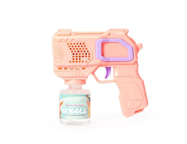 Brinquedo lançador de bolhas de sabão feito em plástico. Ao acionar o gatilho, dispara múltiplas bolhas de uma só vez. Funciona com quatro pilhas AA (não inclusas) e acompanha frasco com líquido para formar bolhas e adesivos para decoração.
