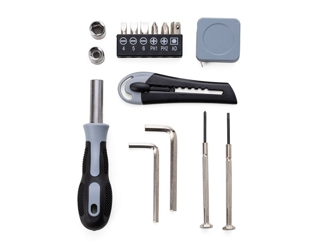 Lanterna LED com Kit Ferramentas 15 peças, o kit contém: Mini chave de fenda, Mini chave philips, Cabo emborrachado para encaixe de ponta de chave de fenda e chave philips, 3 pontas de chave de fenda, 2 pontas de chave philips, 2 chaves hexagonais em L, 2 soquetes de chave hexagonal, Trena de 1 metro, Estilete e Extensor para soquete de chave hexagonal.