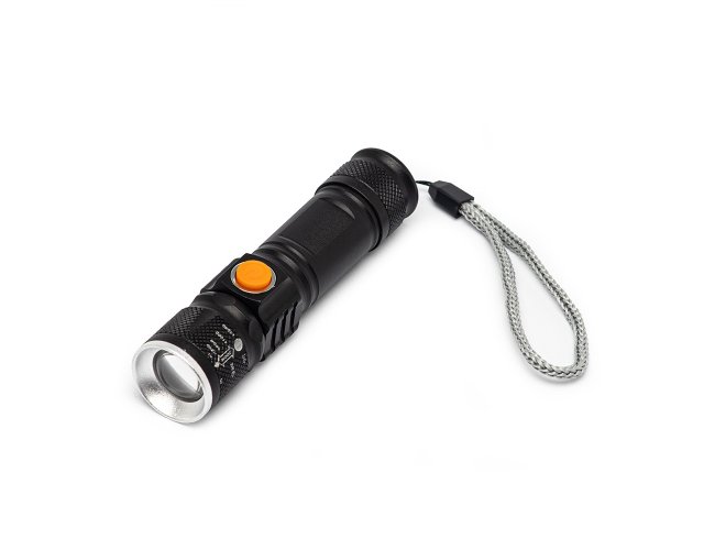 Lanterna led recarregável com zoom de regulagem e três estágios de iluminação, material metálico com USB acoplado para carregamento. Acompanha cordão de nylon.