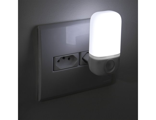 Uma luminária de tomada com estrutura minimalista em plástico, iluminação em LED, voltagem de 220V e acionamento via interruptor. Estas características proporcionam alto brilho ao ambiente com baixo consumo de energia.