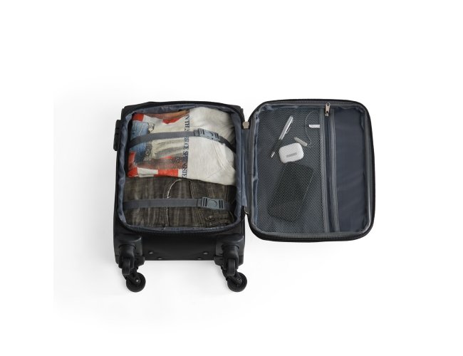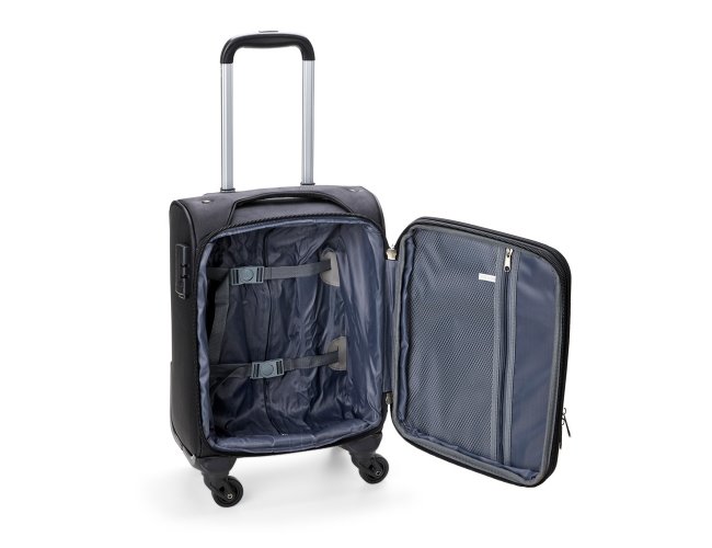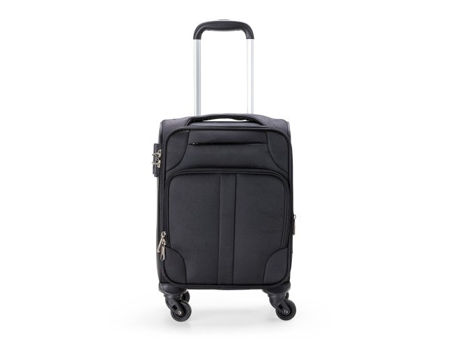 Mala de bordo 30 litros com padrão ANAC (Agência Nacional de Aviação Civil), confeccionada em poliéster de alta qualidade, com cadeado numérico TSA. Possui etiquetas de identificação embutidas na mala, sendo uma integrada ao cadeado e outra na parte de trás da mala, acoplada por estojo em couro sintético. Três compartimentos, bolso telado, cinta compressora para roupas, alça de mão em poliéster, puxador retrátil com regulagem de tamanho, zíper expansível e quatro rodinhas 360º.