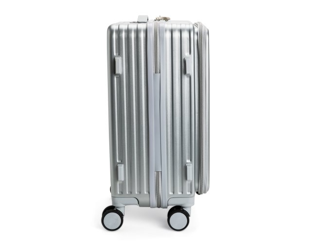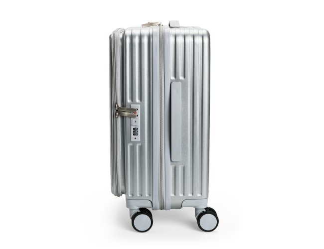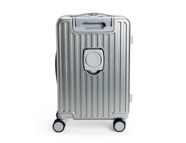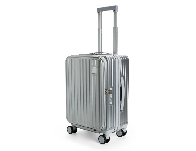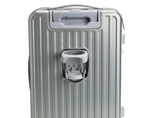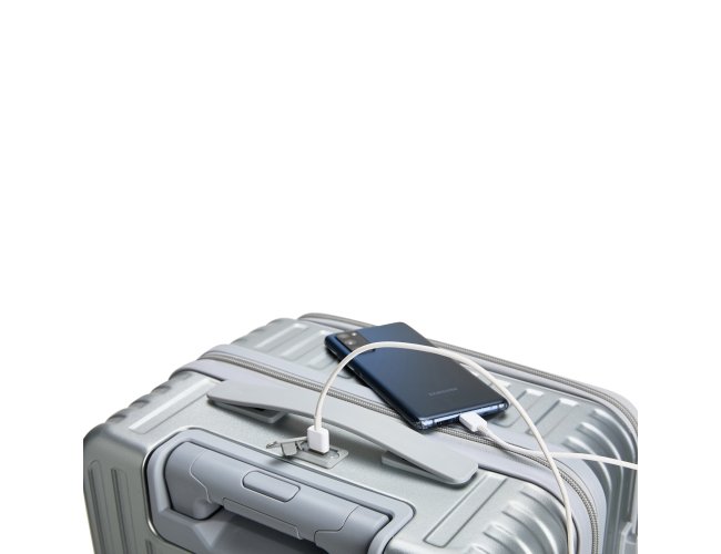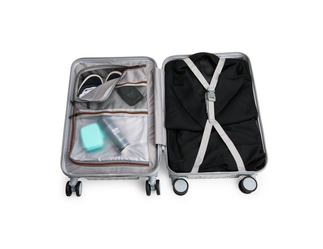 Mala de viagem feita em policarbonato (PC) com capacidade de até 32 litros. Apresenta compartimentos internos de difernetes tamanhos, incluindo um bolso telado e outro em plástico para itens molhados, além de cinta compressora no lado oposto. Possui alça superior, alça lateral, puxador retrátil ajustável em dois níveis, quatro rodinhas com rotação de 360 graus, suporte para copo ou garrafa, quatro apoios laterais e cadeado numérico TSA. Dispõe ainda de compartimento frontal com três bolsos em tamanhos variados.