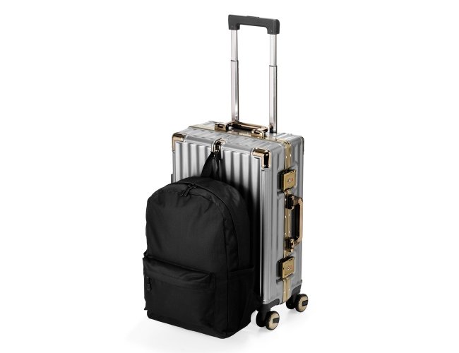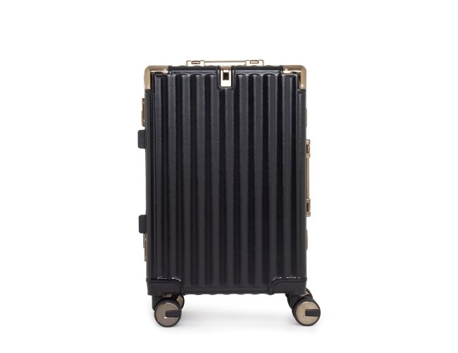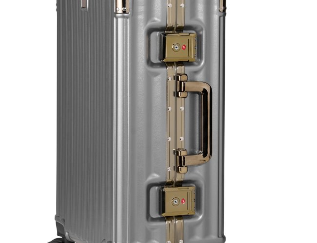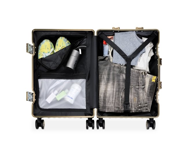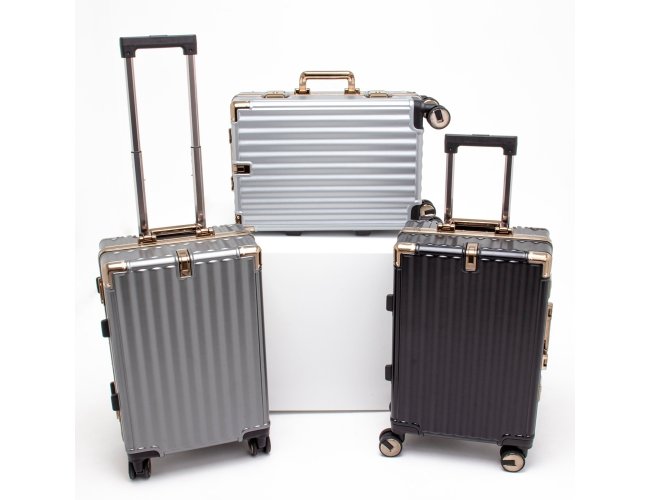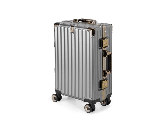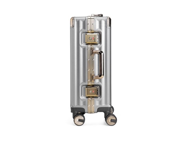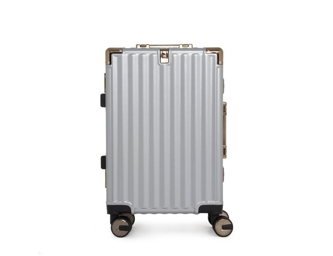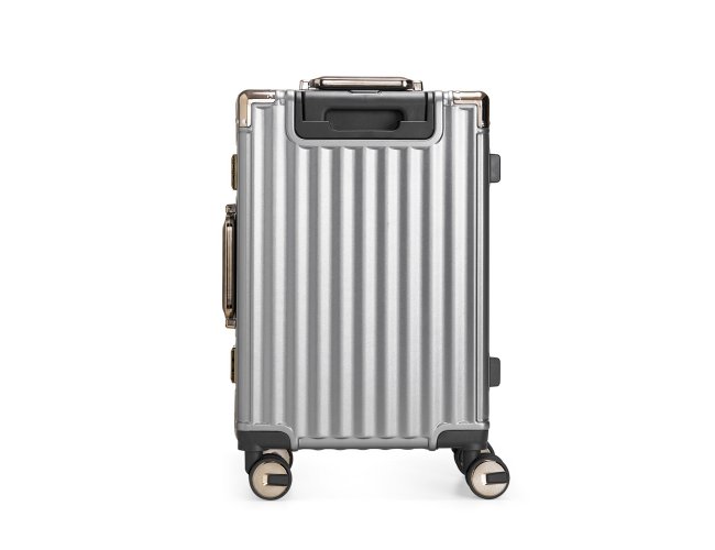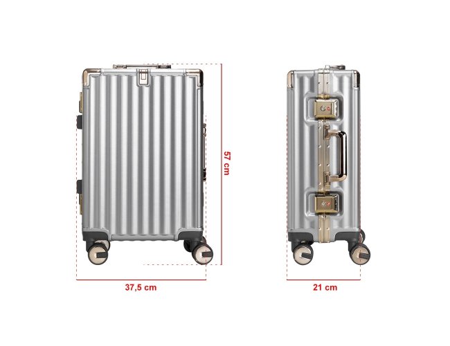 Mala de viagem 39 litros feita em plástico com acabamento em alumínio, contém cadeado numérico TSA. Compartimentos internos com bolso telado, bolso plástico para itens molhados e cinta compressora para roupas. A mala possui duas alças de mãos, puxador retrátil com regulagem de tamanho, suporte porta bolsa, quatro rodinhas 360º e apoios laterais.