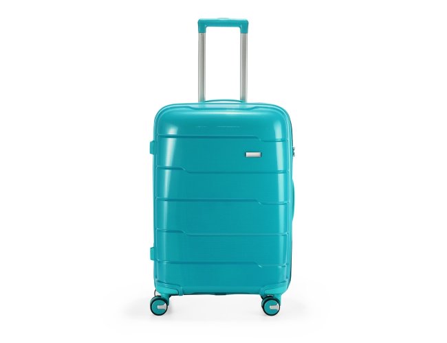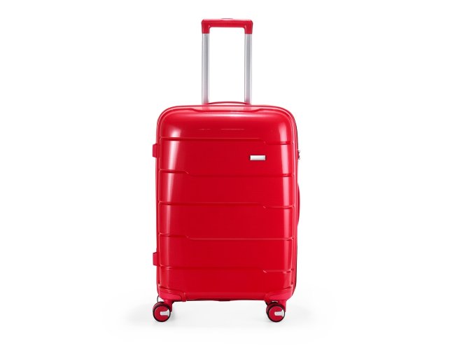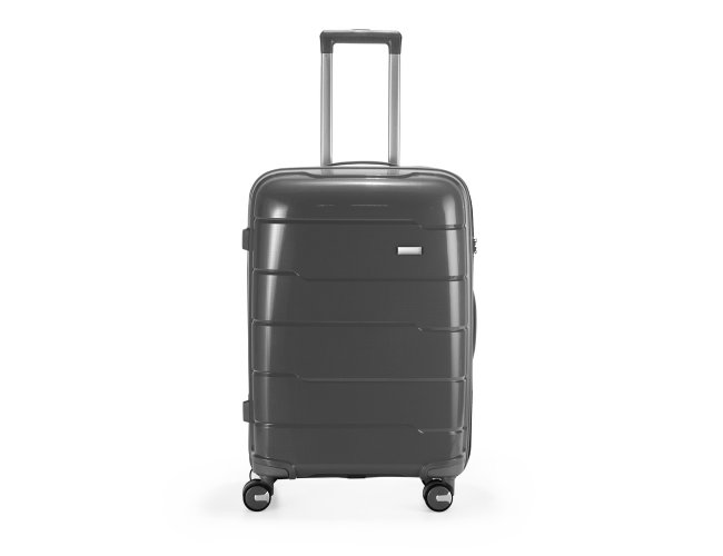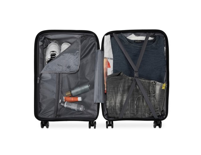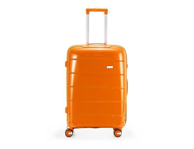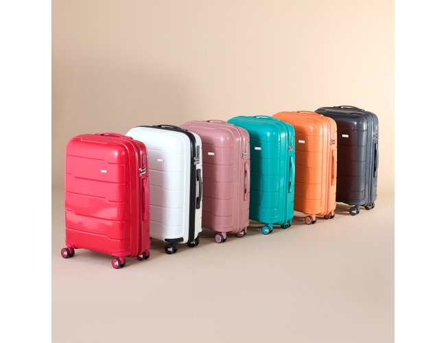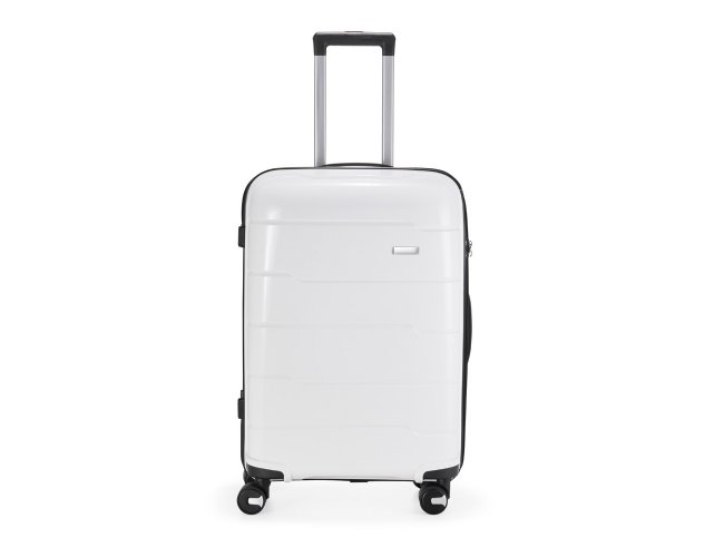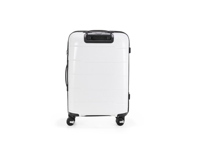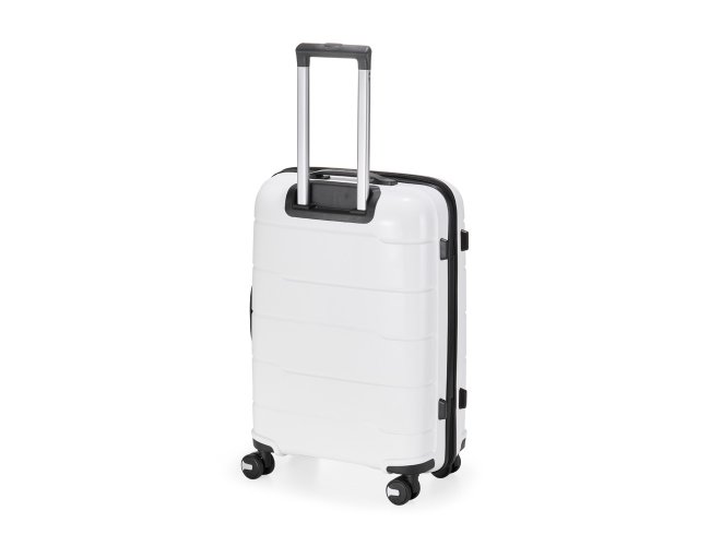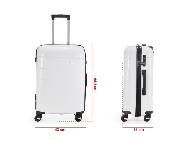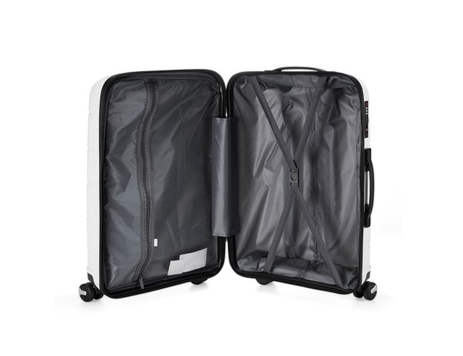Mala de viagem 66 litros em plástico PP (casca dura), contém cadeado numérico TSA. Compartimentos com bolso telado e cinta compressora para roupas. A mala possui duas alças de mão, puxador retrátil com regulagem de tamanho, quatro rodinhas 360º e apoios laterais. Acompanha placa para personalização.