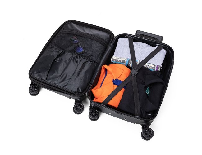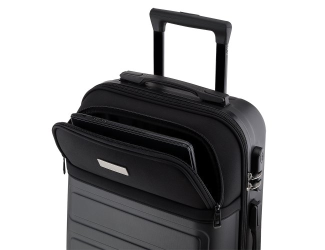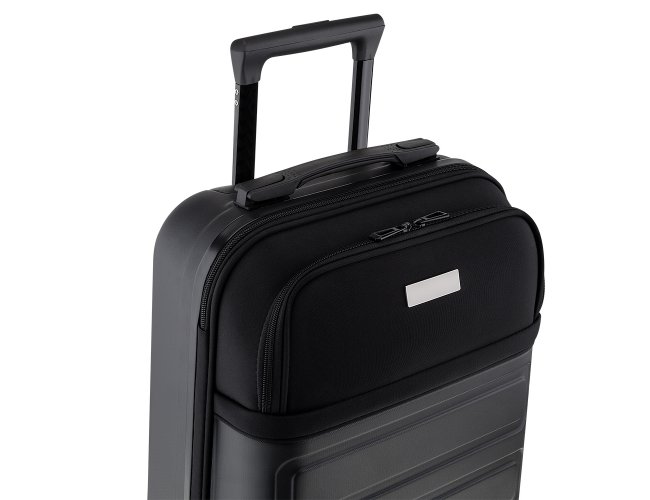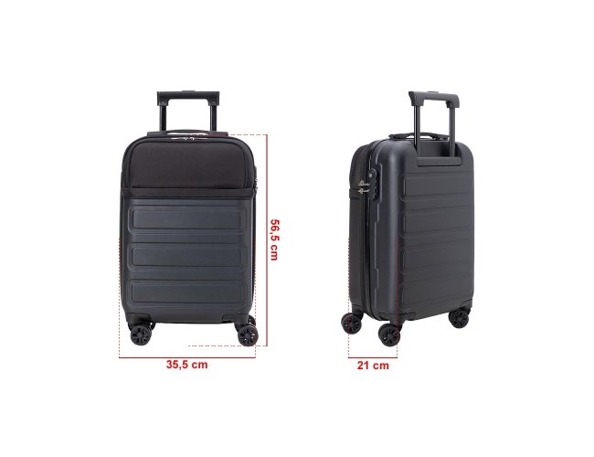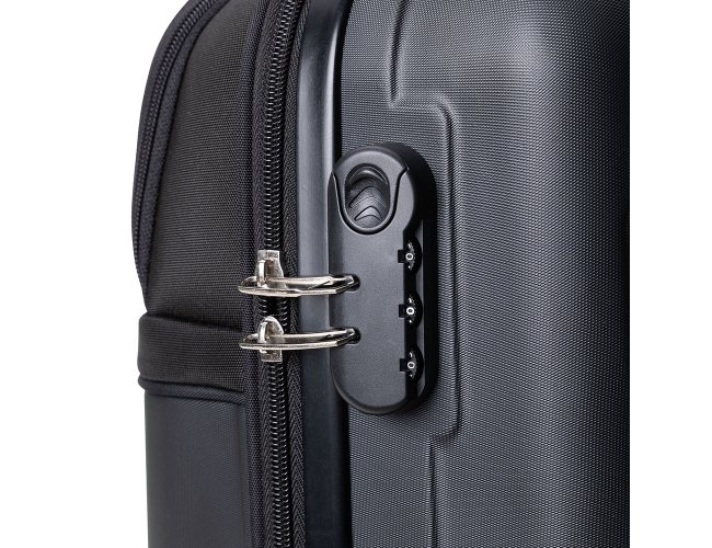 Mala de viagem com segredo, feita em plástico ABS e tecido, possui 2 divisões internas, sistema de carrinho de aço, alça de mão superior e lateral, rodas 360 graus e acompanha plaquinha para personalização.
