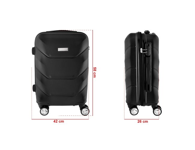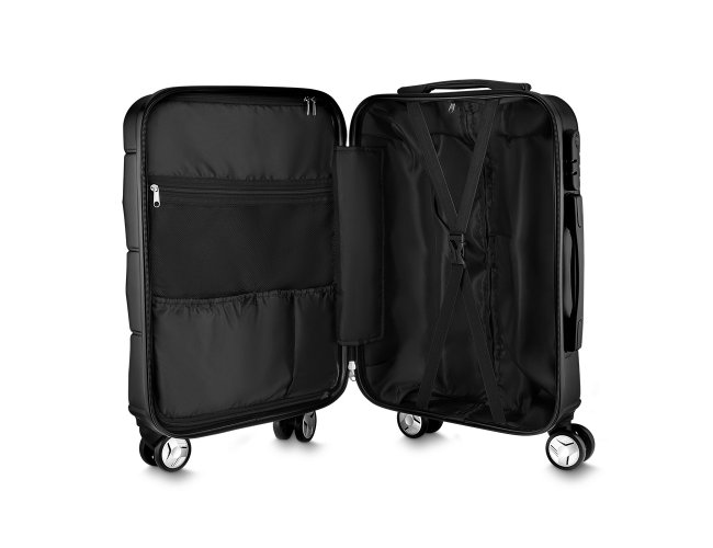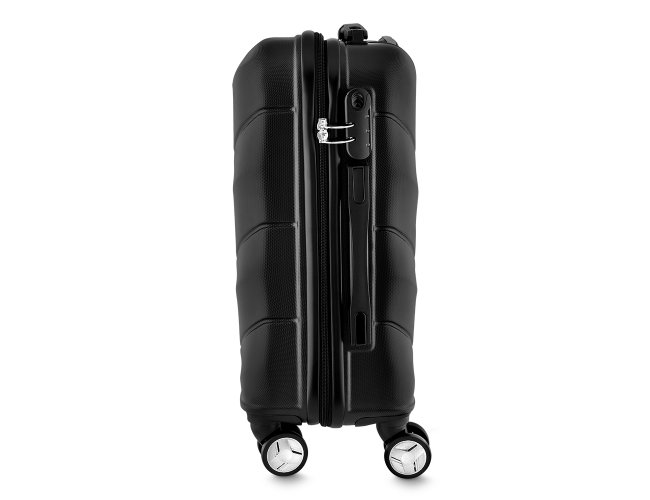 Mala de viagem média confeccionada em ABS com trava de segurança. Possui quatro rodinhas e apoiadores com borracha anti-deslizante para posicionar a mala na horizontal, alça de carrinho com botão para ajuste de tamanho; placa central para personalização; forro de poliester e compartimentos internos de zíper além de um cinto protetor.