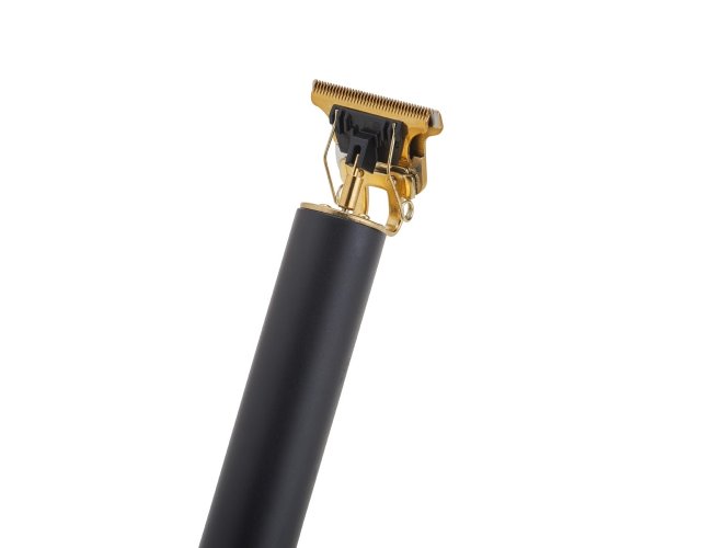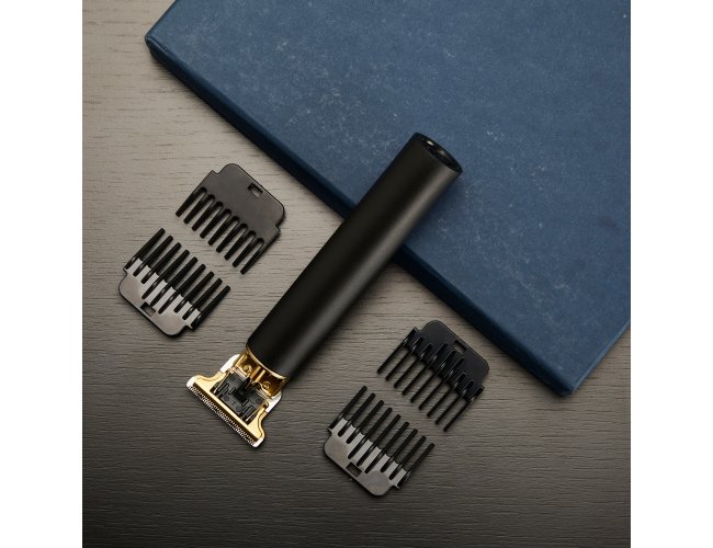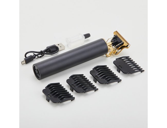 Máquina de cortar cabelo recarregável com lâminas em aço inoxidável e corpo plástico. Acompanha 4 pentes plásticos (1.5mm, 2mm, 3mm e 4mm), escova de limpeza, óleo lubrificante e cabo USB-V8.