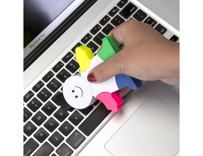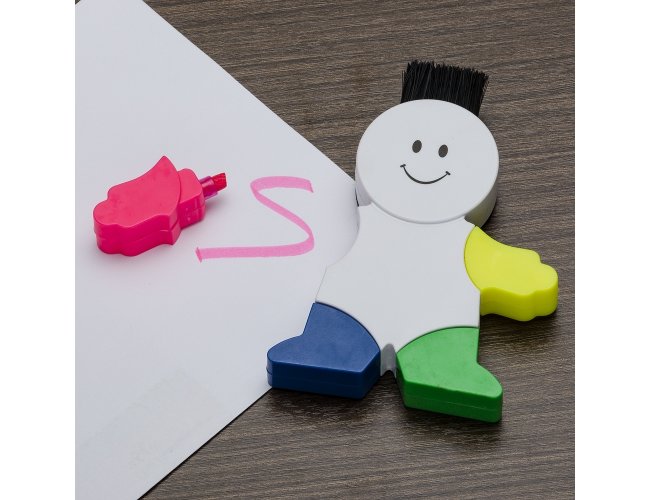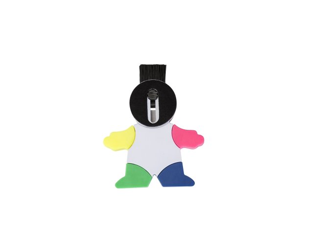 Caneta marca texto com limpador de tela e teclado. Boneco plástico branco com olhos e boca em preto, marca texto nas cores: amarelo, azul, rosa e verde. Parte traseira com feltro para limpeza de tela e teclado, para acionar as cerdas(limpador de teclado) basta movimentar o botão para cima ou para baixo.