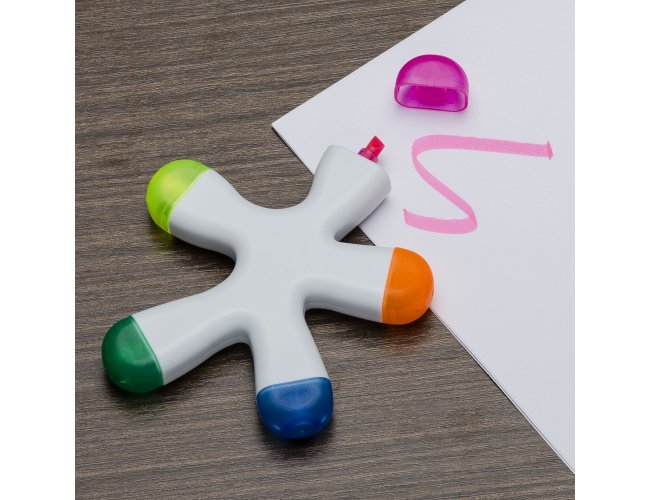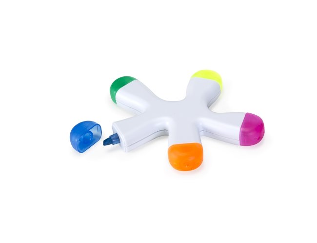 Caneta marca texto em formato splash na cor branca de frente e verso liso, possui as cores: azul, amarelo, laranja, rosa e verde.