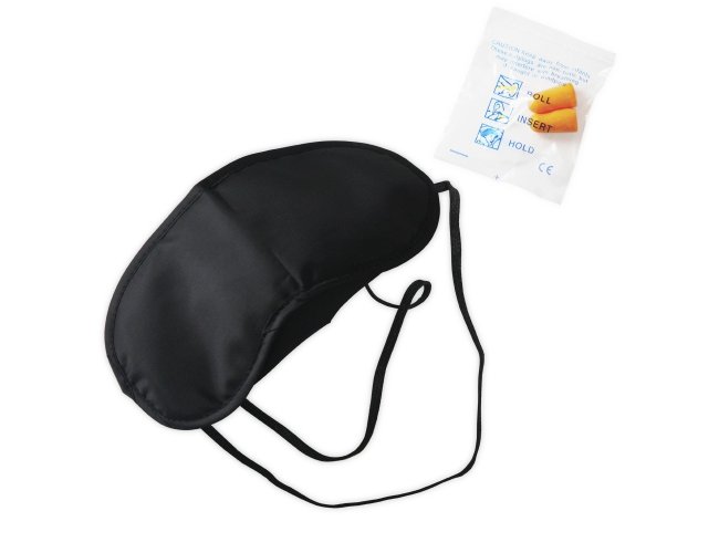 Máscara de olhos para dormir, material de cetim revestido internamente com espuma para um maior conforto. Possui doi elásticos de nylon, acompanha par de protetores auriculares.