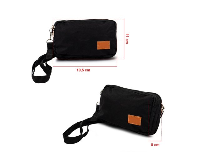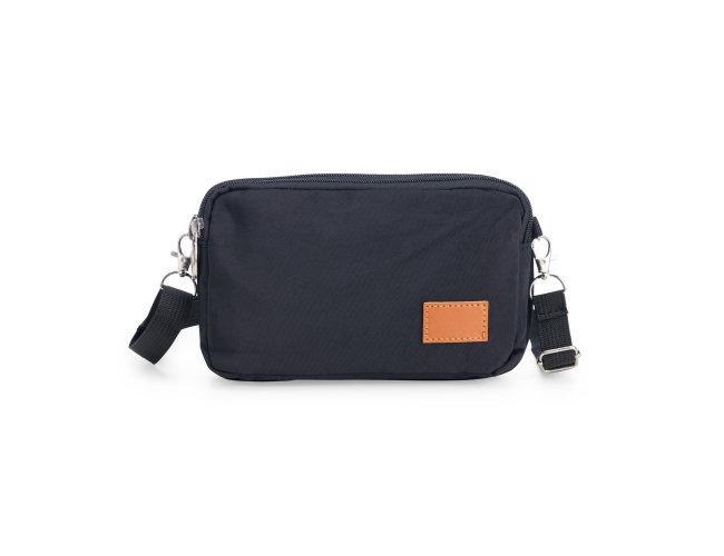 Bolsa de ombro em nylon resistente à água, com três compartimentos, alça regulável e etiqueta com espaço para personalização em couro sintético. Executando o papel de ser um bolso extra para guardar e encontrar rapidamente os acessórios do dia a dia.
