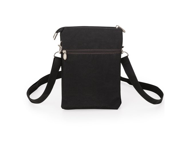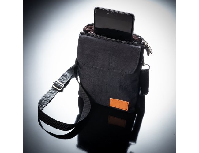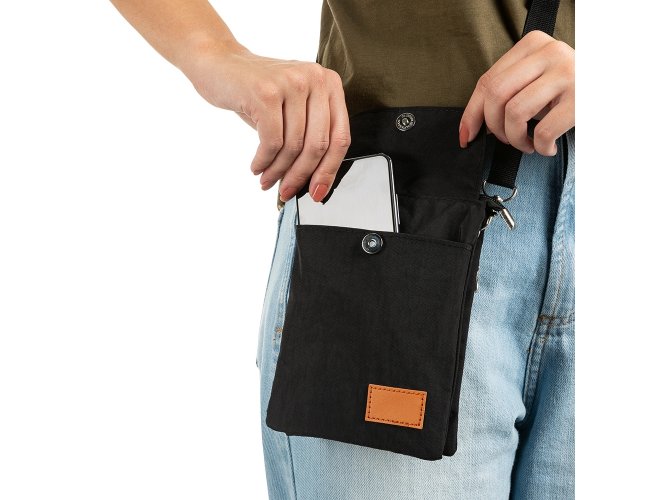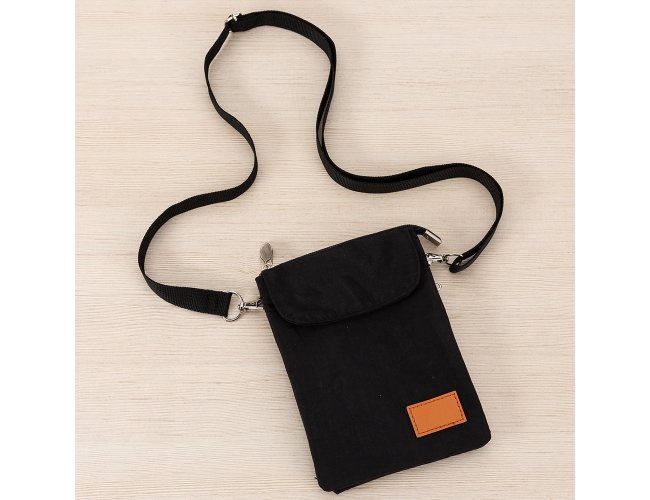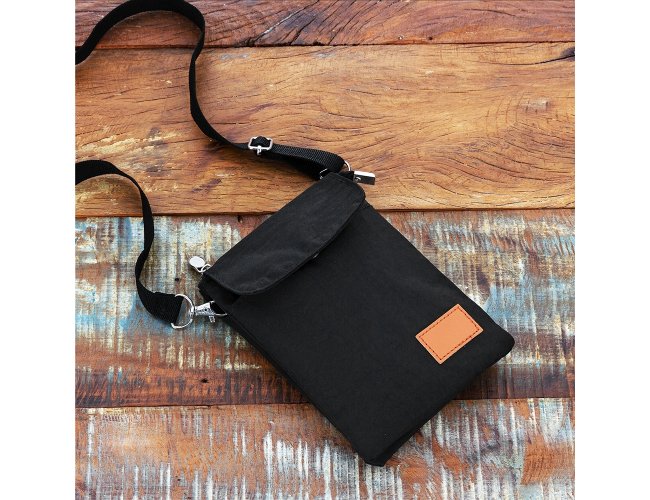 Bolsa de ombro em nylon 1 litro, resistente à água com três compartimentos e plaquinha personalizável em couro sintético.