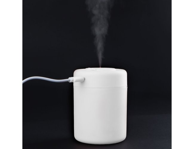 Mini umidificador de ar plástico com capacidade para 180ml de água. Acompanha filtro de algodão e cabo USB.