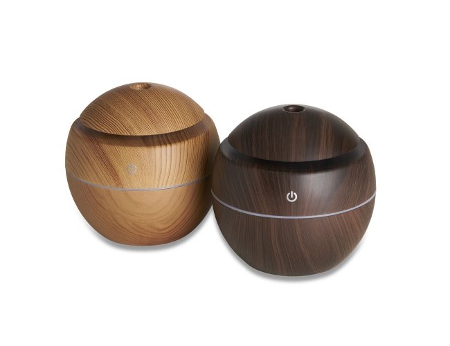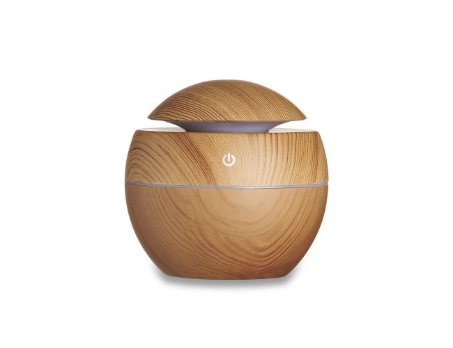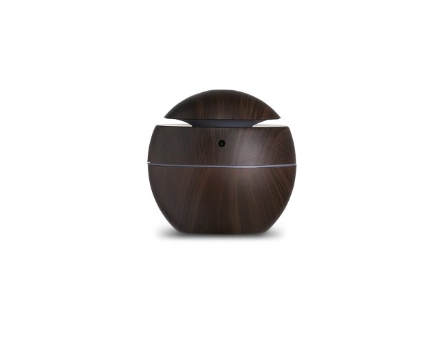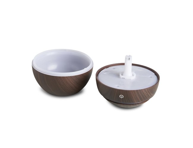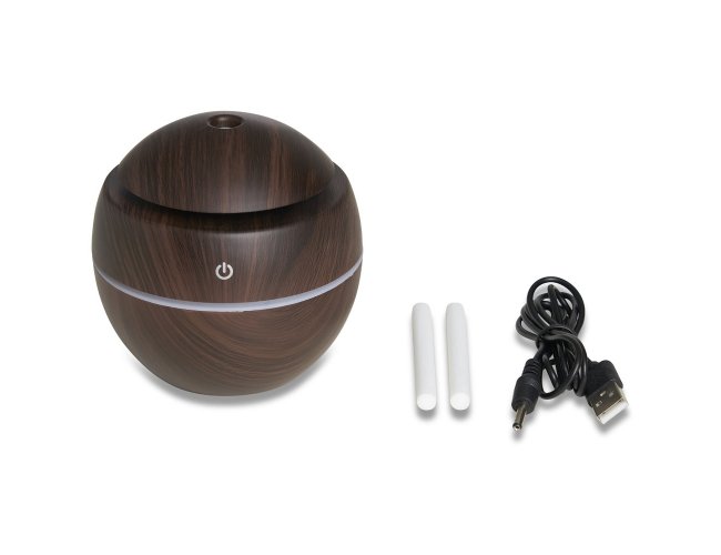 Mini umidificador ultrassônico com led que muda de cor. Acompanha filtro de algodão e um cabo USB. Capacidade para 130ml de água. Produzido em plástico e revestido por adesivo caracterizando madeira. Taxa de tensão DC5V e Taxa de consumo de 2W. O produto não retém energia, funciona somente com o cabo USB conectado a um meio de alimentação de energia. Obs.: para conservação do produto é recomendável utilizar água filtrada e não deve ser usado essências!