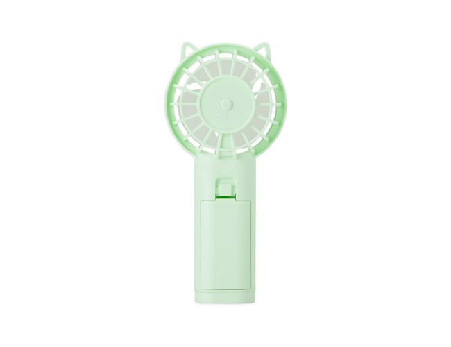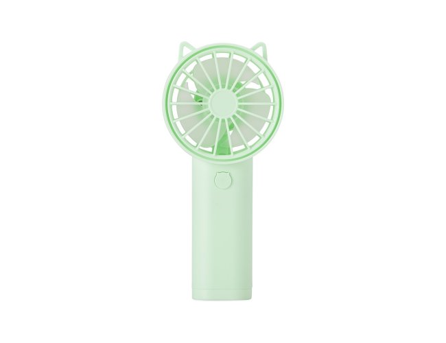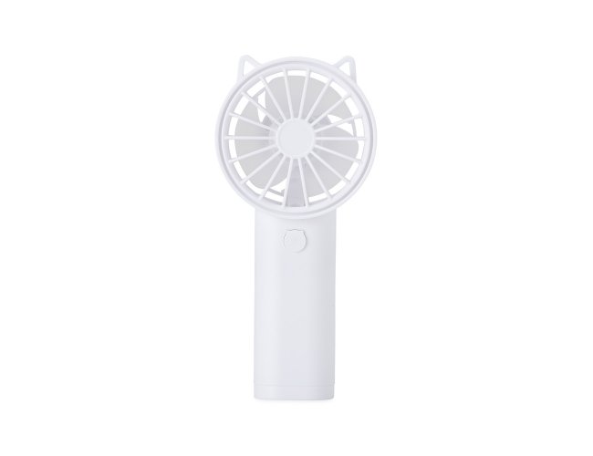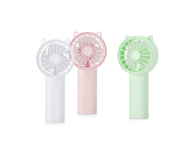 Mini ventilador plástico com botão de acionamento. Para o funcionamento, utiliza-se duas pilhas AA (não acompanha).