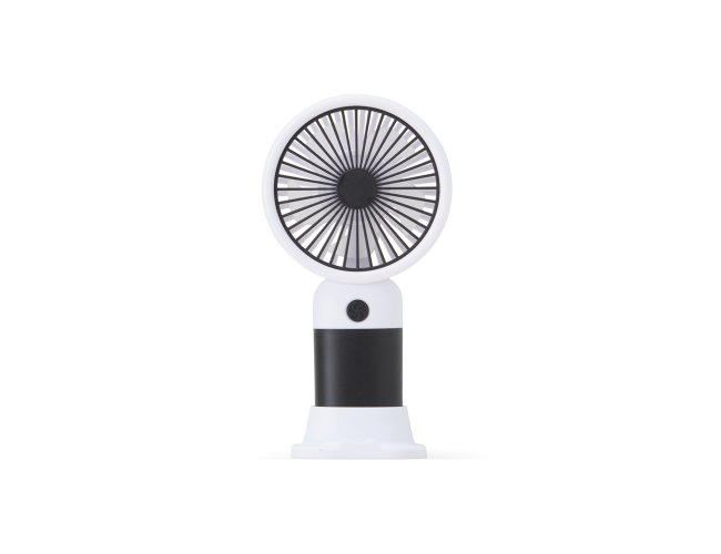 Mini ventilador plástico recarregável com base removível e botão de acionamento. Acompanha cabo usb.
