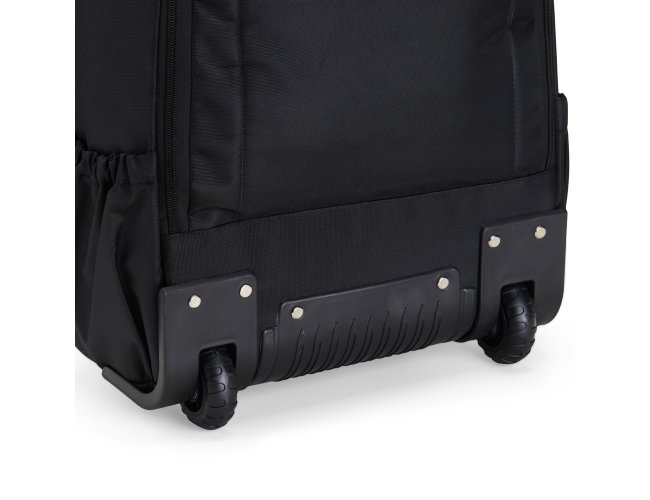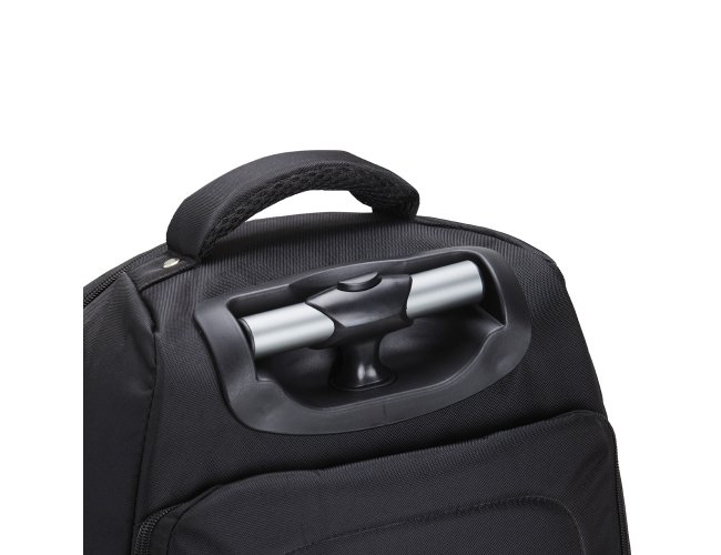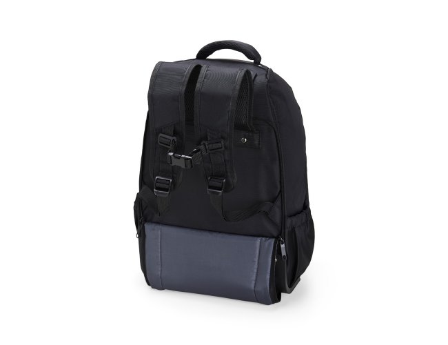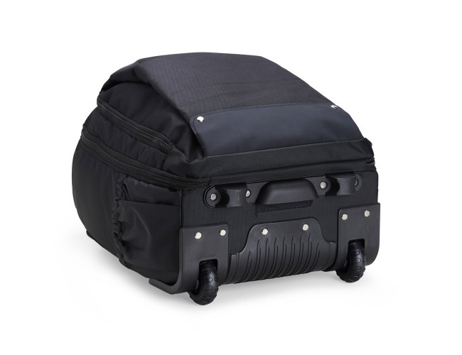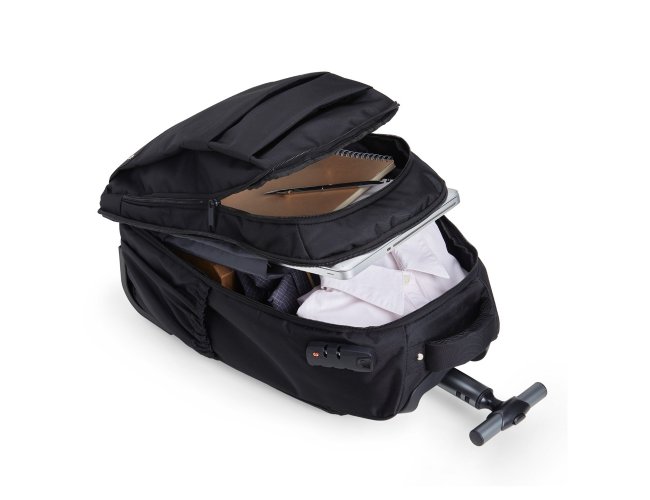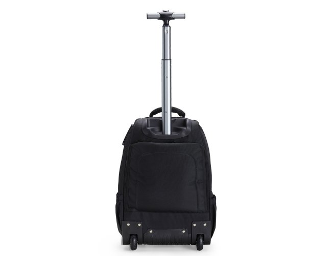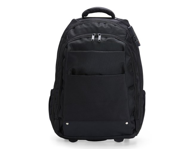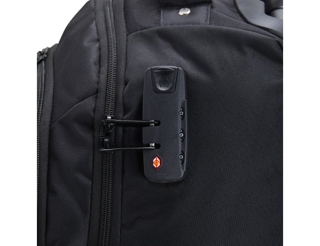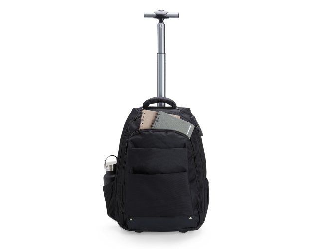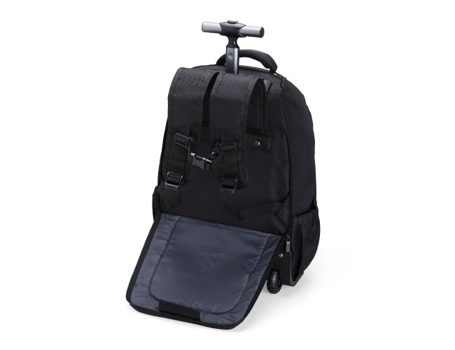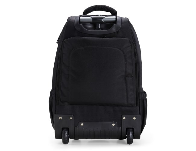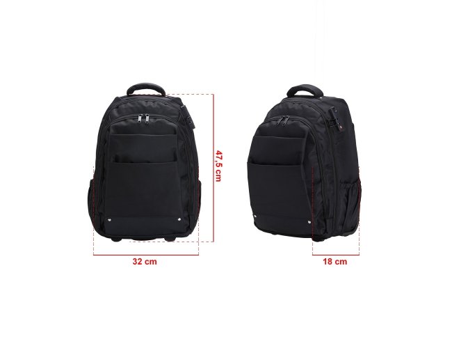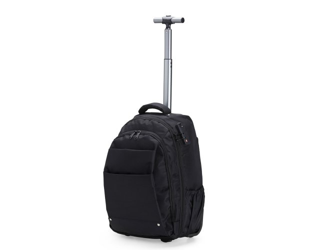 Mochila 27 litros com rodinhas e cadeado TSA. Possui padrão para bagagem de mão, conforme especificações ANAC (Agência Nacional de Aviação Civil) Confeccionada em nylon, contém alça revestida com espuma para um maior conforto, puxador retrátil com regulagem e botão acionador, alças para as costas escondidas no compartimento traseiro com zíper. Com 5 compartimentos, sendo um pequeno para carteira e canetas, dois medianos para documentos, bolsos nas laterais, bolso para notebook até 15,6 polegadas com divisórias para celular e forro com zíper. Possui duas rodinhas e freio em plástico, além de um sistema velcro para junção do compartimento das alças com a parte inferior, tampando as rodinhas enquanto transporta a mochila nas costas.