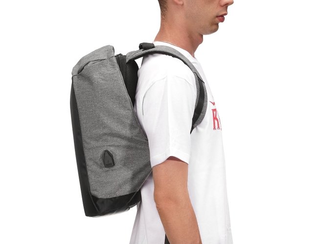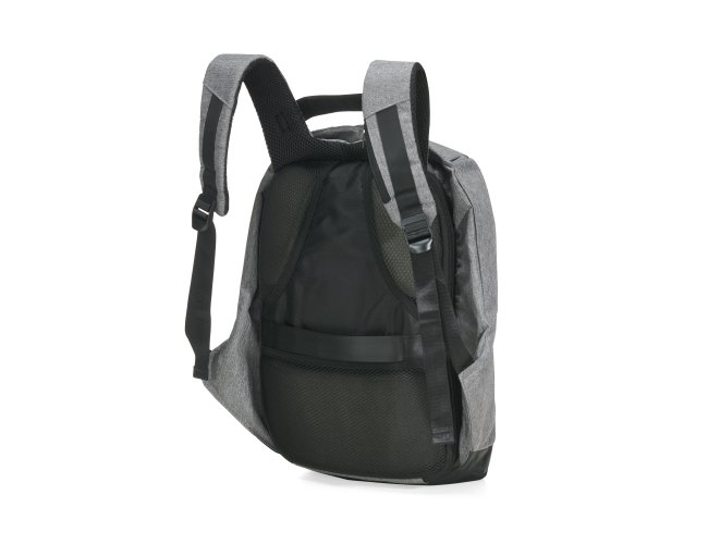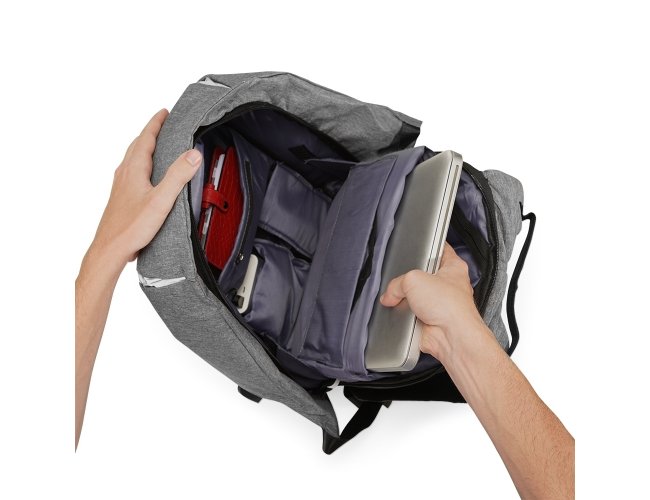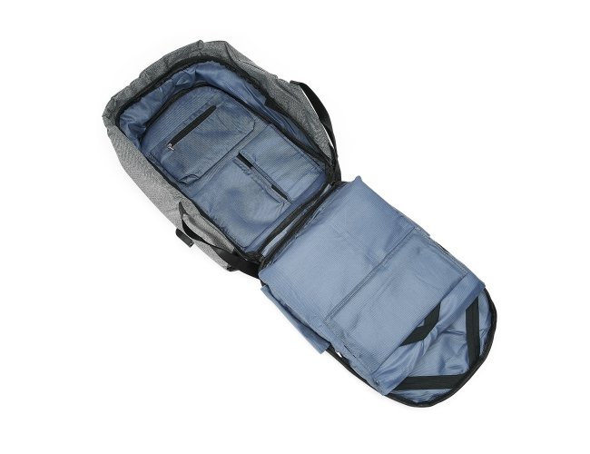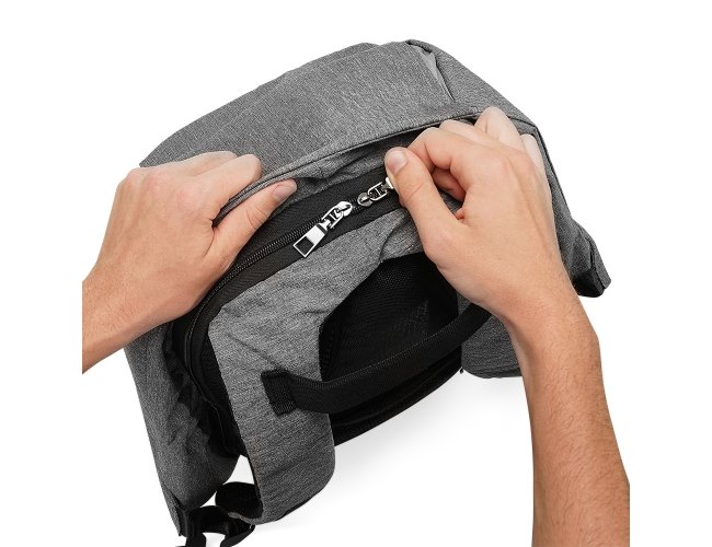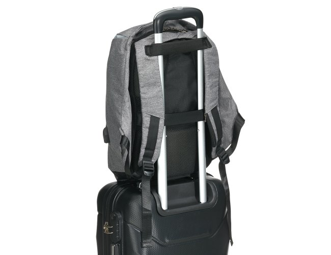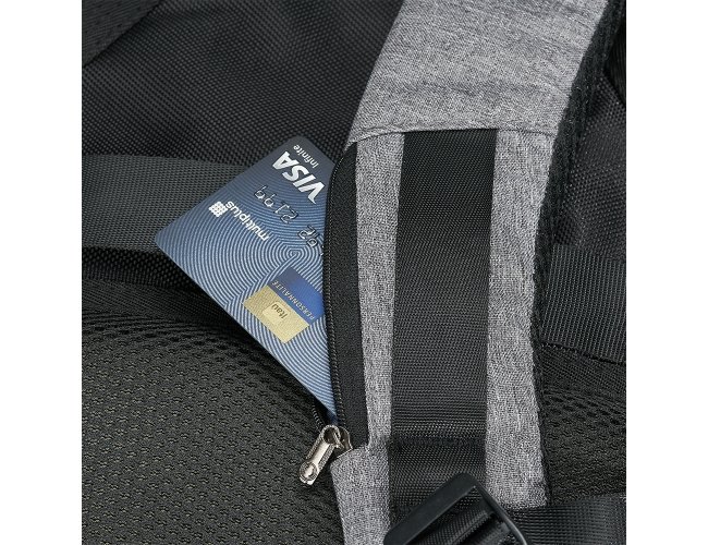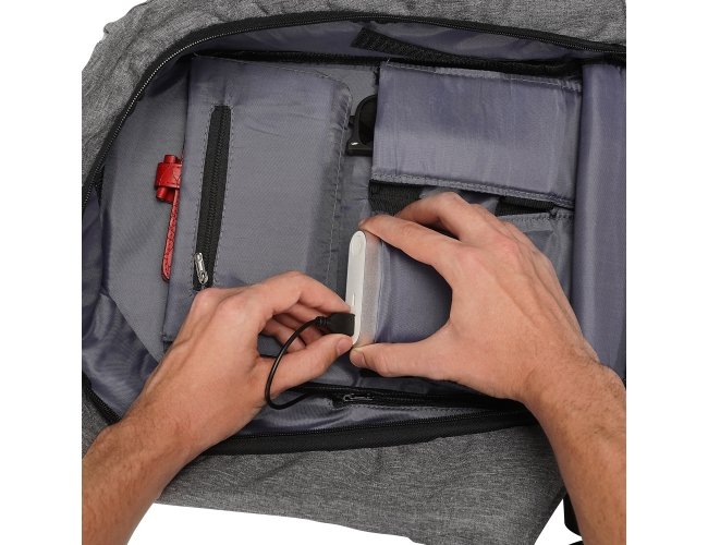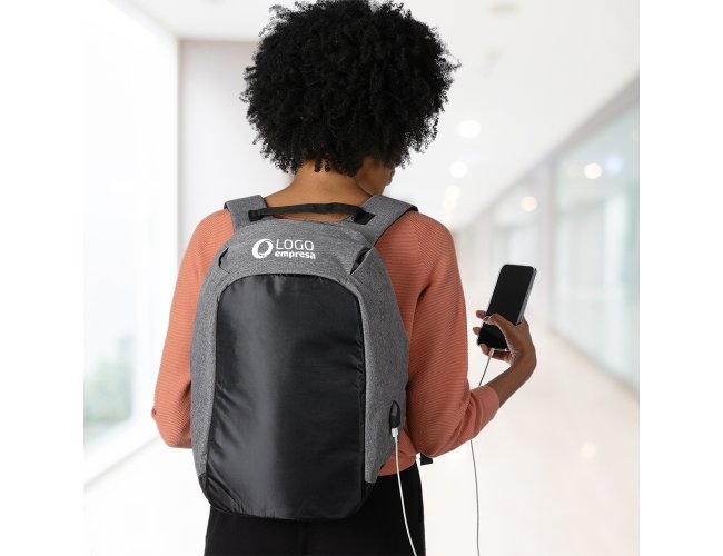 Compartimento principal com amplo espaço e bolso para notebook 14, bolsos internos, suporte externo usb, alça para encaixe em malas de viagem e revestimento costado espumado. Mochila anatômica antifurto de 24 litros em poliéster resistente à água com dois compartimentos, sendo um deles exclusivo para cartões.