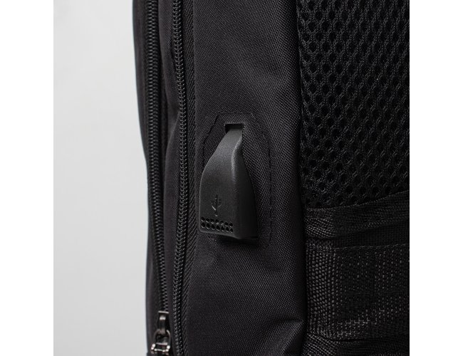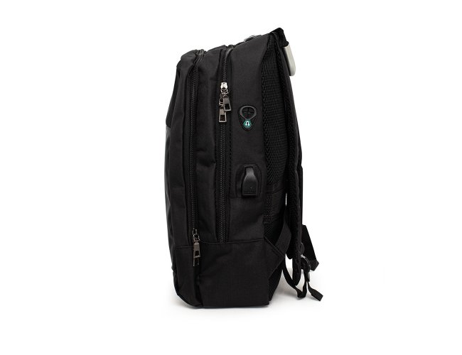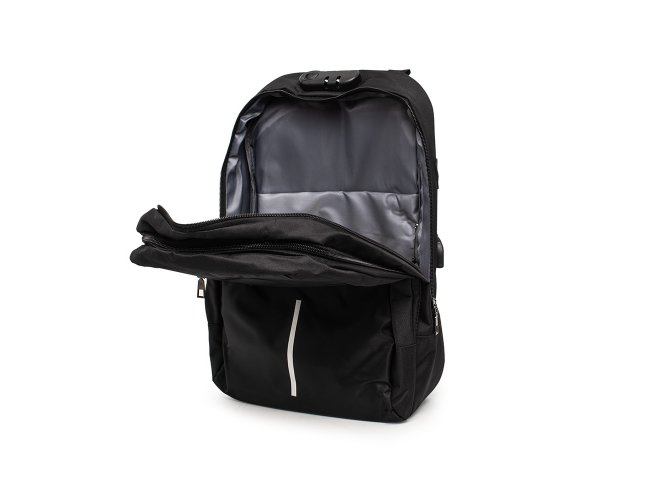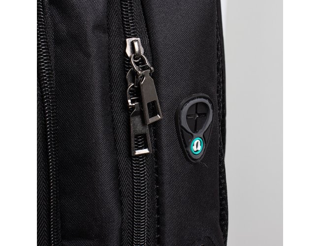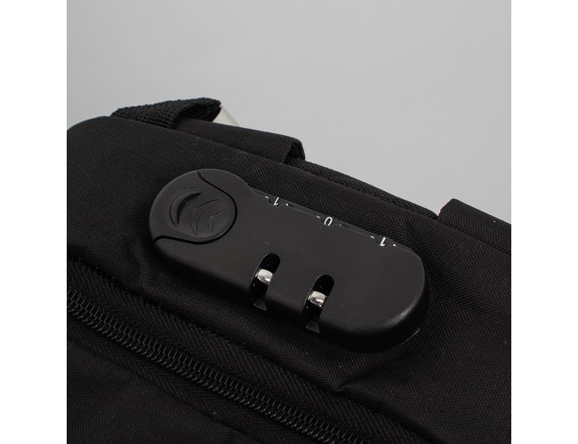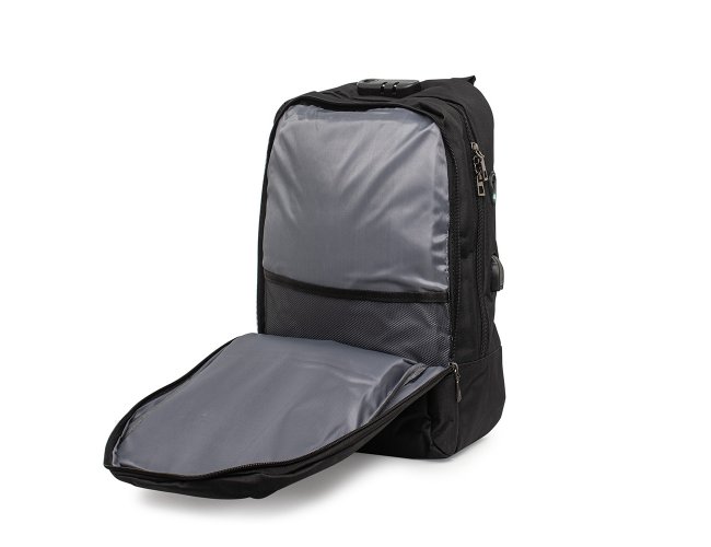 Mochila antifurto com cadeado de segredo. Produzido em poliéster, tem a parte frontal à prova d?água (respingos). Compartimento principal com bolso para notebook 15,6 e divisórias, bolso de tela, parte externa com cadeado de segredo para trava dos zíperes; e bolso frontal. Possui entrada para fone de ouvido, suporte com entrada USB na parte externa e cabo USB acoplado internamente; permitindo a conexão de um carregador portátil na área interna e a conexão de um eletrônico na área externa, viabilizando a carga e utilização do eletrônico enquanto caminha. Alças para as costas ajustáveis revestidas com espuma, alça para mãos em alumínio e alça para encaixe em malas de viagem. Utilização do cadeado: para criar um segredo, pressione e segure o botão, crie a numeração desejada e em seguida solte o botão para assumir a codificação criada. Repita o mesmo processo sempre que necessitar fazer alguma alteração.