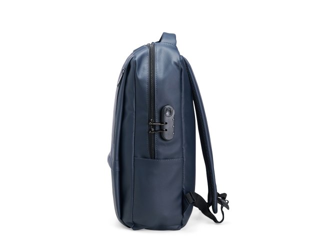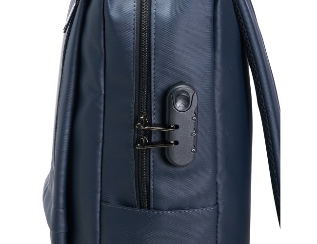Mochila em Oxford impermeável com capacidade para até 22 litros. Possui compartimento interno com divisória para notebooks de até 15,6 polegadas, além de dois bolsos frontais com fechamento em zíper e mais um par de bolsos laterais abertos. Conta ainda com suporte externo USB, cadeado numérico e alças de mão e de costas com revestimento acolchoado.