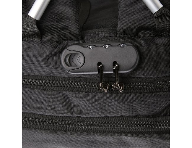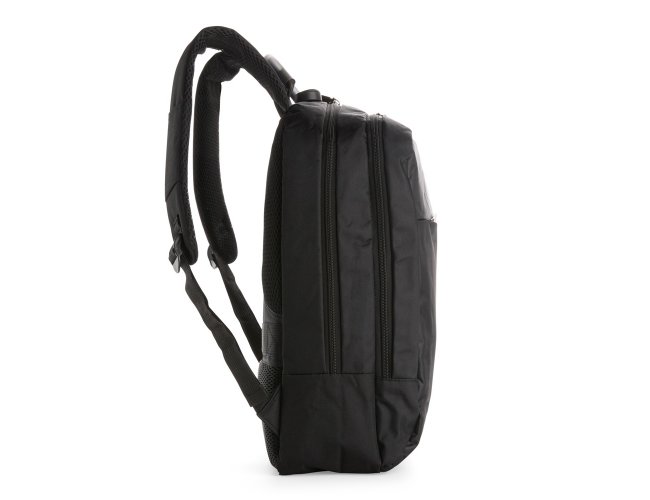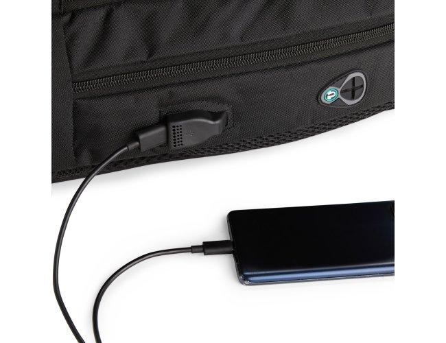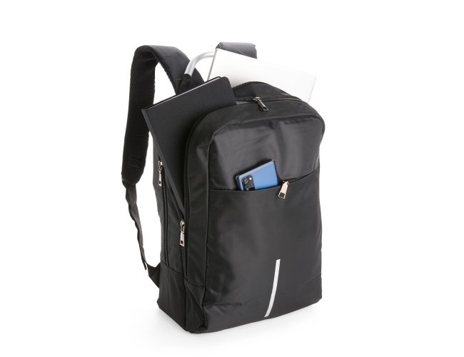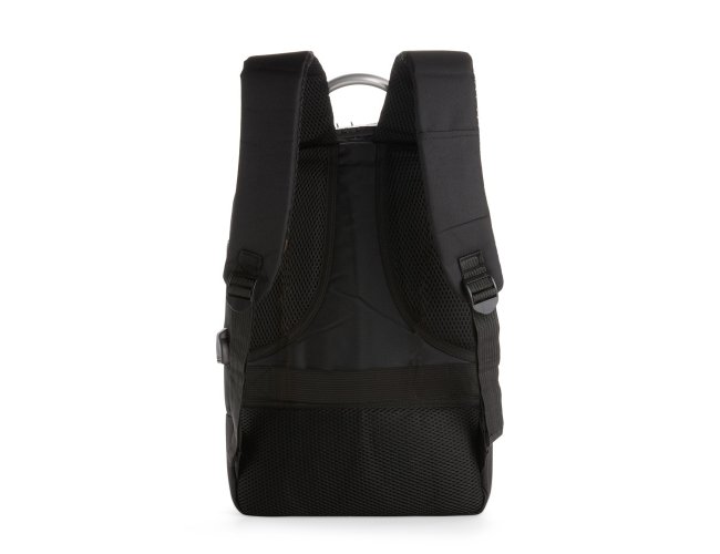 Mochila antifurto em poliéster impermeável, com capacidade de 16 litros e fechamento em zíper. Possui cadeado de segredo, entrada externa para cabo USB, passagem para fones de ouvido, três compartimentos de diferentes tamanhos, incluindo bolso frontal com divisória para notebook de até 15,6 polegadas e alça superior reforçada. Conta ainda com engate para malas, alças de costas e painel traseiro acolchoados.