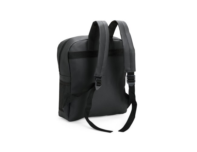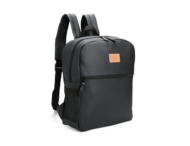 Mochila feita em couro sintético impermeável, com fechamento em zíper e capacidade máxima de 20 litros. Apresenta divisória interna, ideal para notebooks de até 14 polegadas. Conta também com um bolso frontal com uma plaquinha costurada e dois bolsos laterais em tela feitos em nylon.